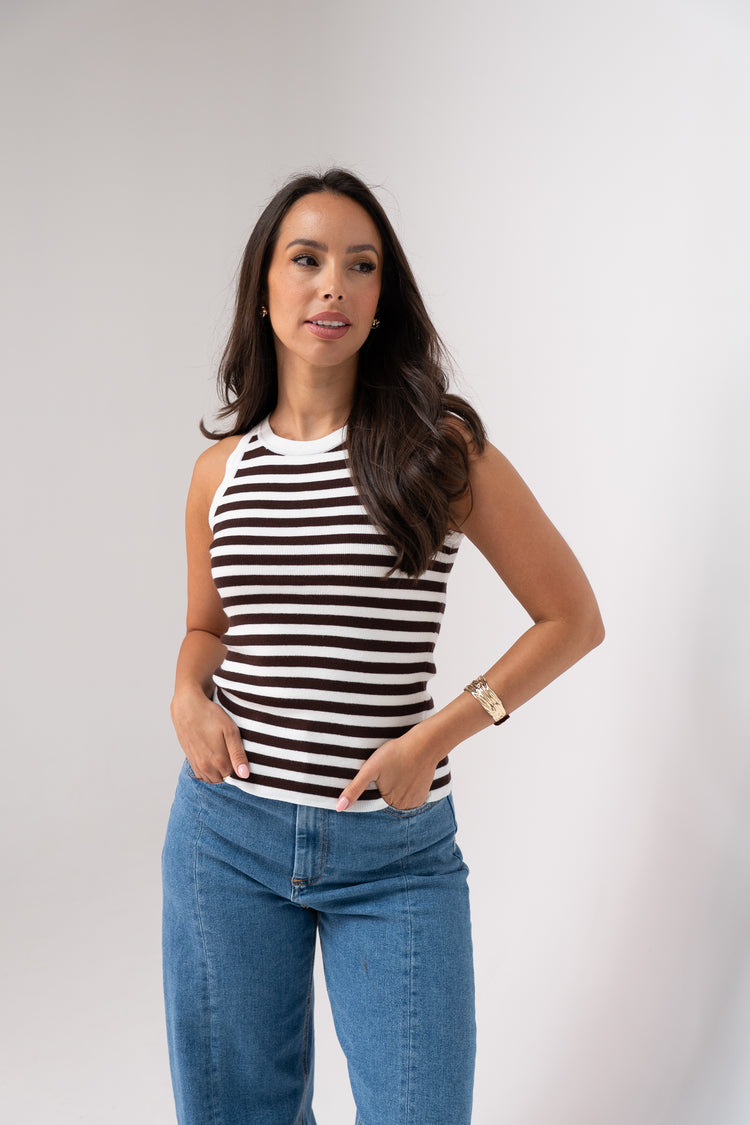 This Ally Stripe Vest Top in chocolate and white features a flattering racer cut and a sleeveless design, crafted from a stretch fabric that comfortably fits sizes 8 to 14. Its classic striped pattern and form-fitting silhouette make it a versatile layer for both casual and refined outfits.