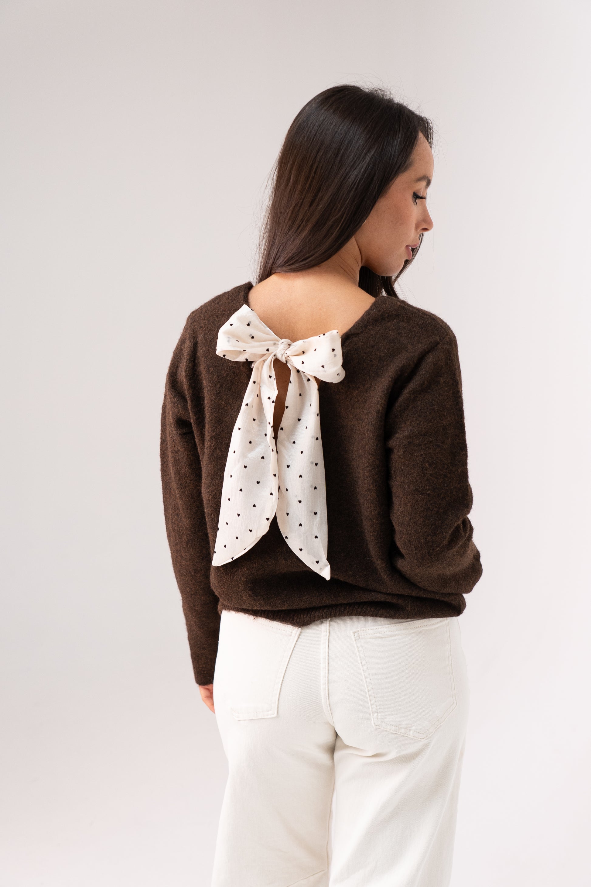 This elegant wool mix jumper features a classic round neck front and a stylish V-back design. The long sleeves provide warmth and comfort, while the heart-shaped polka dot bow at the back adds a unique, sophisticated touch. Designed to fit sizes 8 to 14, this versatile chocolate-coloured piece combines timeless style with cosy practicality.