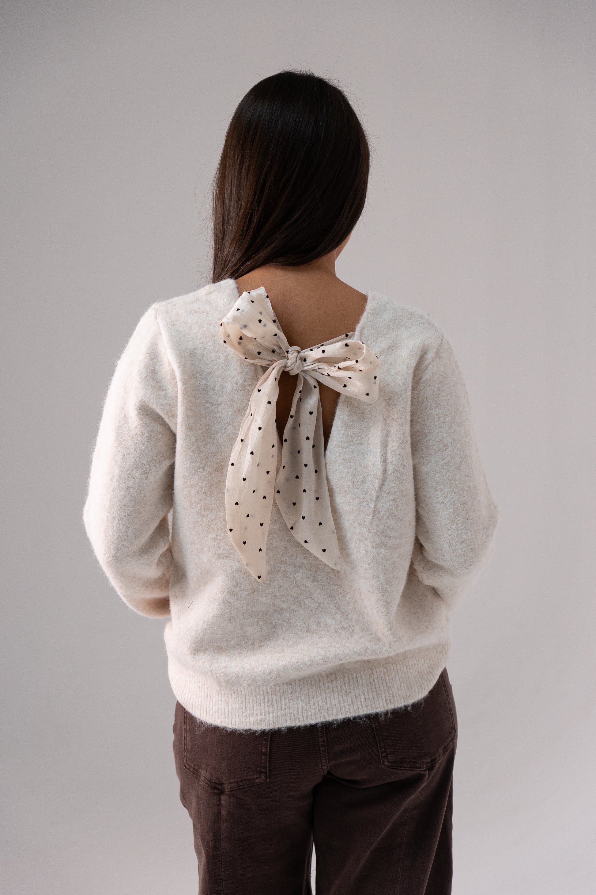 This Belle Polka Dot Bow Jumper in cream combines classic design with subtle detailing. Crafted from a cosy wool mix, it features a comfortable round neck front and a stylish V back highlighted by a heart-shaped polka dot bow. The long sleeves add warmth and elegance, while the versatile one-size design fits sizes 8 to 14, offering both comfort and a flattering fit. Perfect for layering or wearing alone, this jumper is a sophisticated addition to any wardrobe.