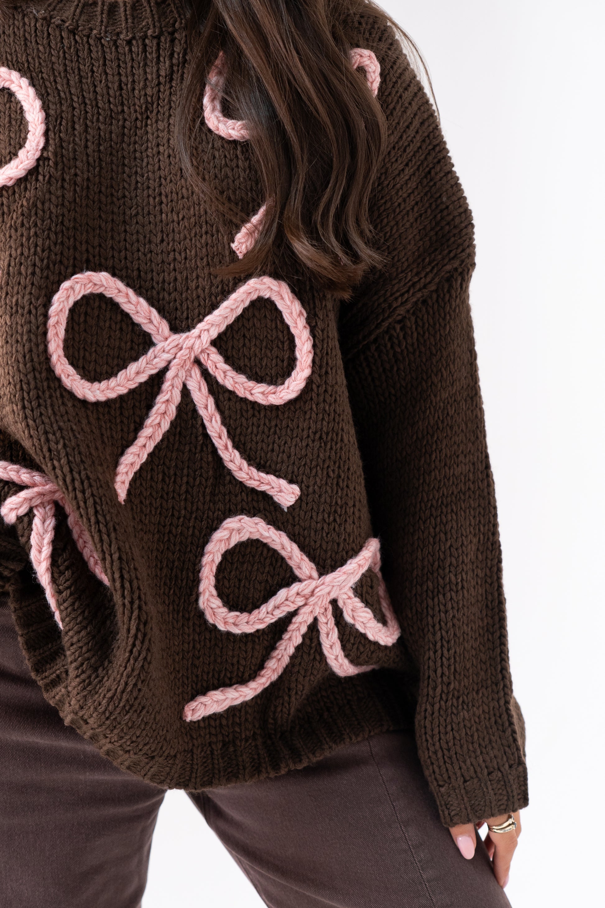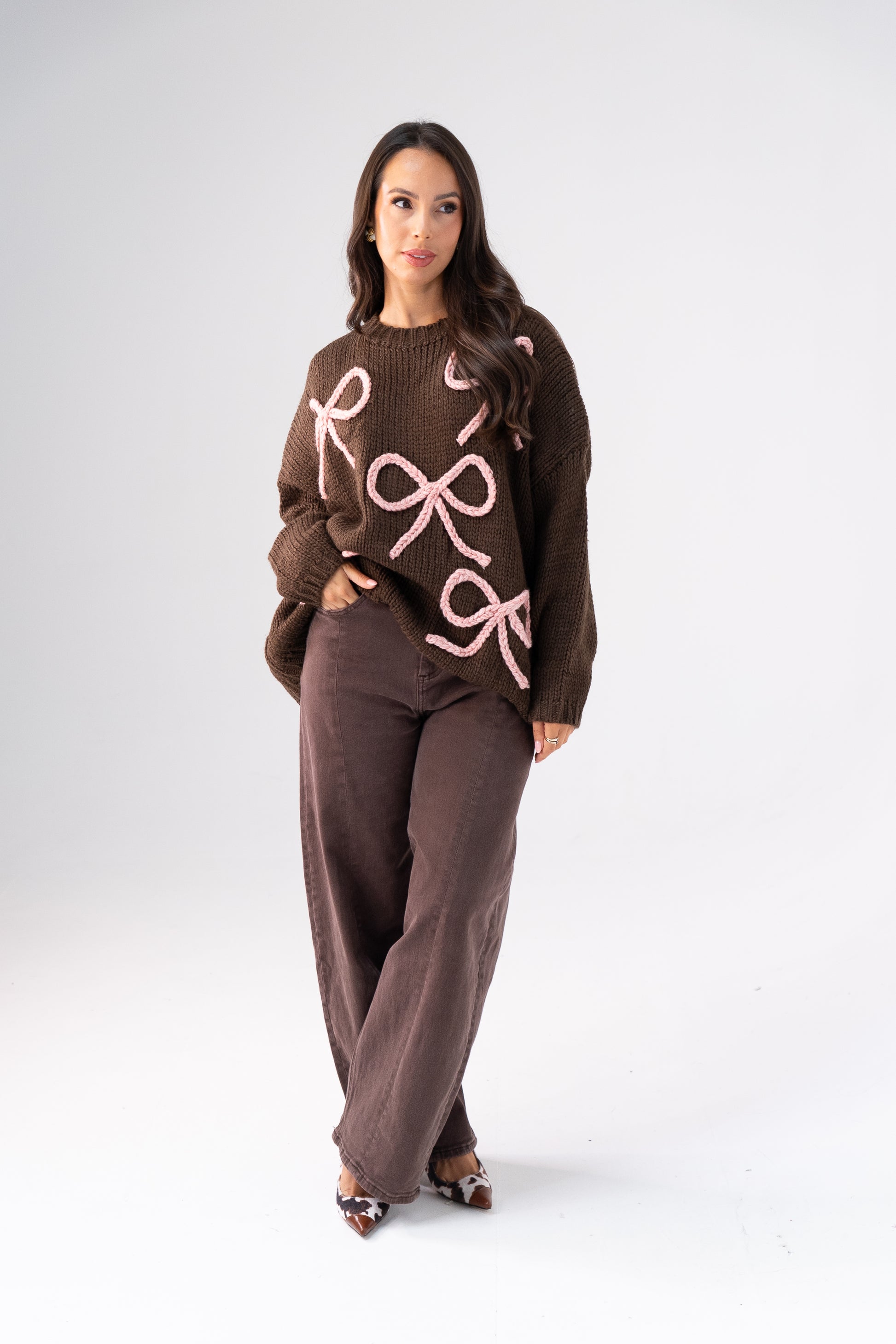 Elevate your knitwear collection with this sophisticated Caitlyn Bow Detail Jumper. Crafted from a luxurious chunky knit in rich chocolate, this piece combines timeless elegance with contemporary style. The round neckline and drop shoulder silhouette create a relaxed, flattering fit, whilst the charming pink bow detail at the front adds a distinctive focal point. Designed to fit sizes 8-14, the long sleeves provide warmth and coverage. Perfect for layering or wearing standalone, this versatile jumper transitions seamlessly from casual weekends to polished occasions.