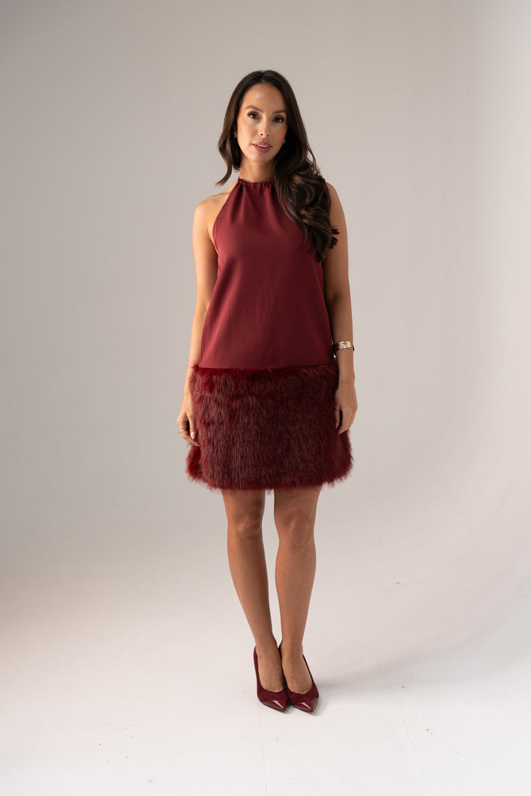 Caitlyn Faux Fur Trim Dress In Burgundy