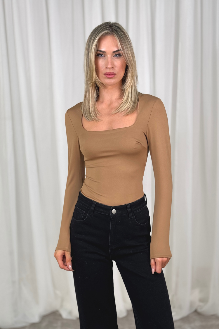 The Caitlyn Square Neck Bodysuit in Camel is a versatile wardrobe staple. With its square neckline and long sleeves, it offers a sophisticated look and flattering fit. This bodysuit also features a stretchy material that ensures comfort and a camel colour that adds a subtle pop to any outfit.