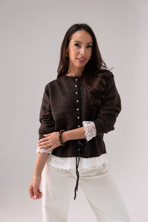 The Cathy Drawstring Cardigan in Grey combines elegant detailing with versatile comfort. Crafted for a one-size 8-14 fit, it features a classic round neck and long sleeves accented by delicate lace trim on the cuffs and hem. The button-front design offers easy layering, while the drop shoulder and adjustable drawstring detail provide a relaxed yet polished silhouette. This cardigan is an expert choice for effortlessly elevating any wardrobe with subtle sophistication.