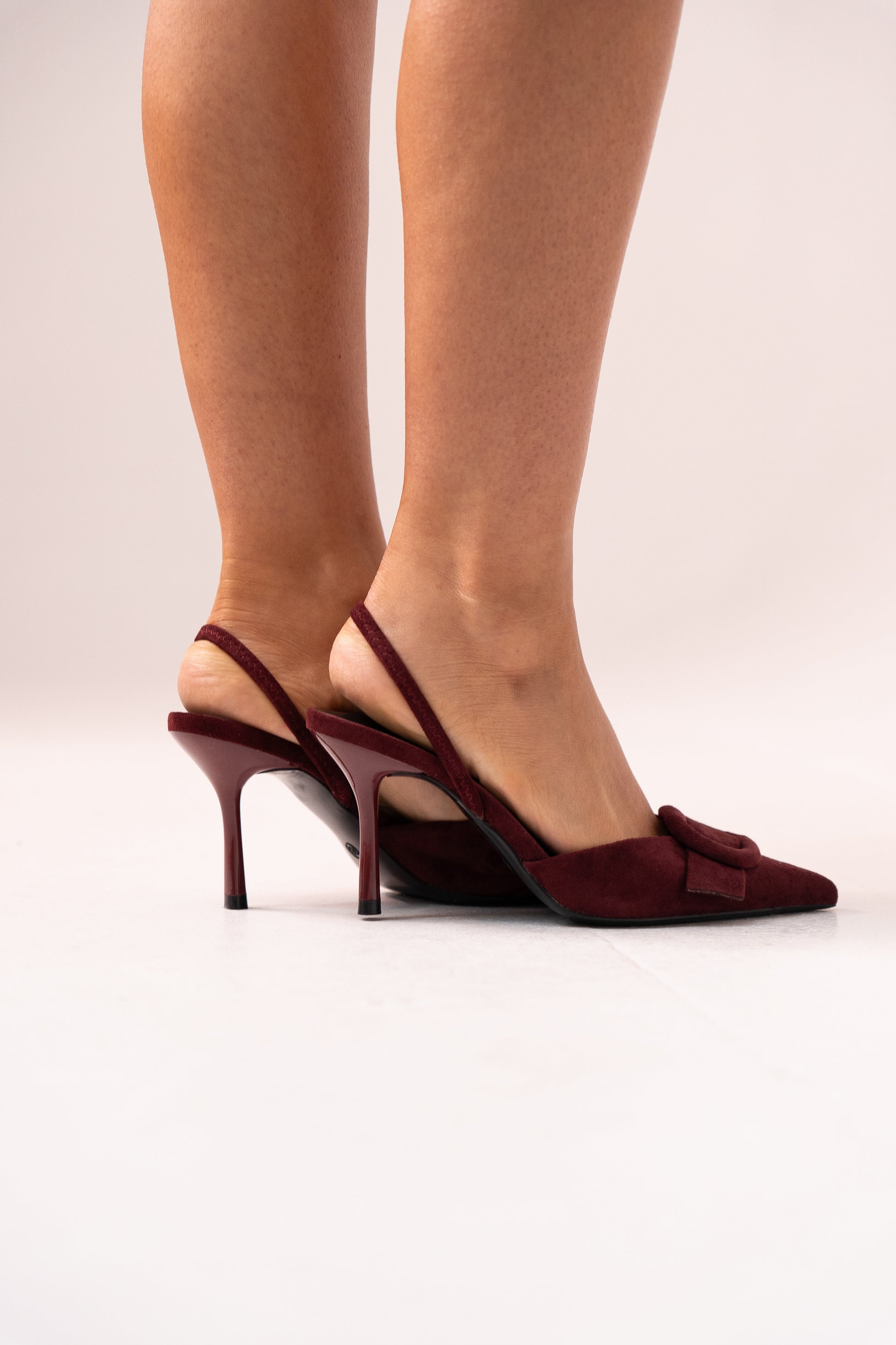 Experience refined elegance with the Cathy Faux Suede Buckle Heel in Wine. Featuring a pointed toe and a sophisticated buckle detail, these slingback heels combine style with comfort. Crafted from plush faux suede in a deep wine hue, they offer a contemporary twist on classic design, ideal for elevating both formal and smart-casual looks.