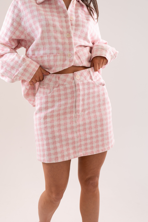 Step into spring with our Daisy Gingham Skirt in Pink. This mini skirt boasts a stunning pink and white gingham pattern, perfect for a stylish and fresh look. With a zip and button front, as well as convenient pockets, this skirt is both fashionable and functional. Made of 100% cotton, it offers both comfort and quality. Complete the look with our matching trousers and jacket.
