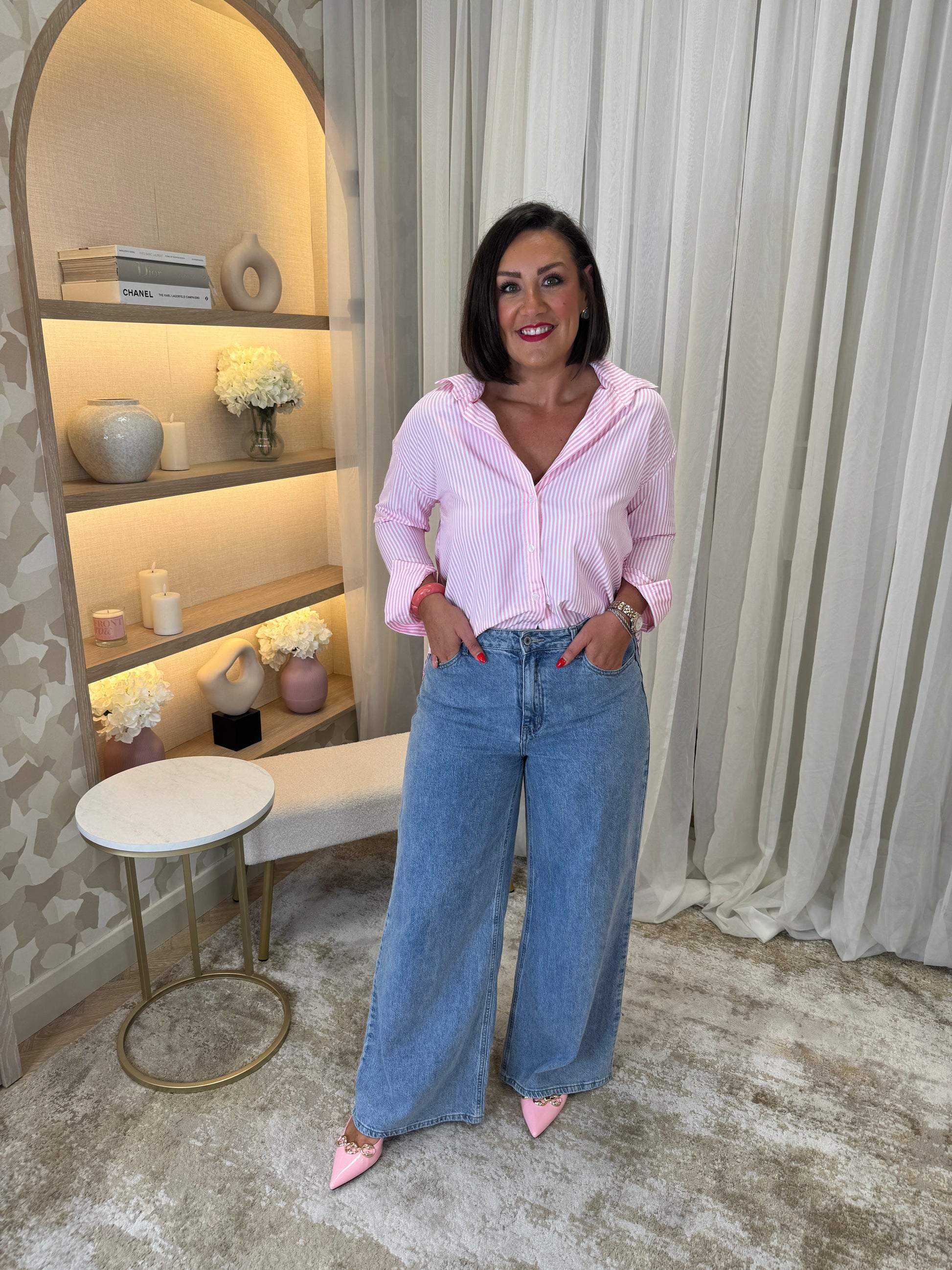 This Danni Stripe Shirt in pink and white features a classic button-front design with a collar and long sleeves, tailored to fit sizes 8 to 14 comfortably. The striped pattern adds timeless style, while the delicate bow detail at the back introduces a subtle, feminine touch. Perfect for both professional and casual settings, this shirt combines elegance with versatility for a polished look.