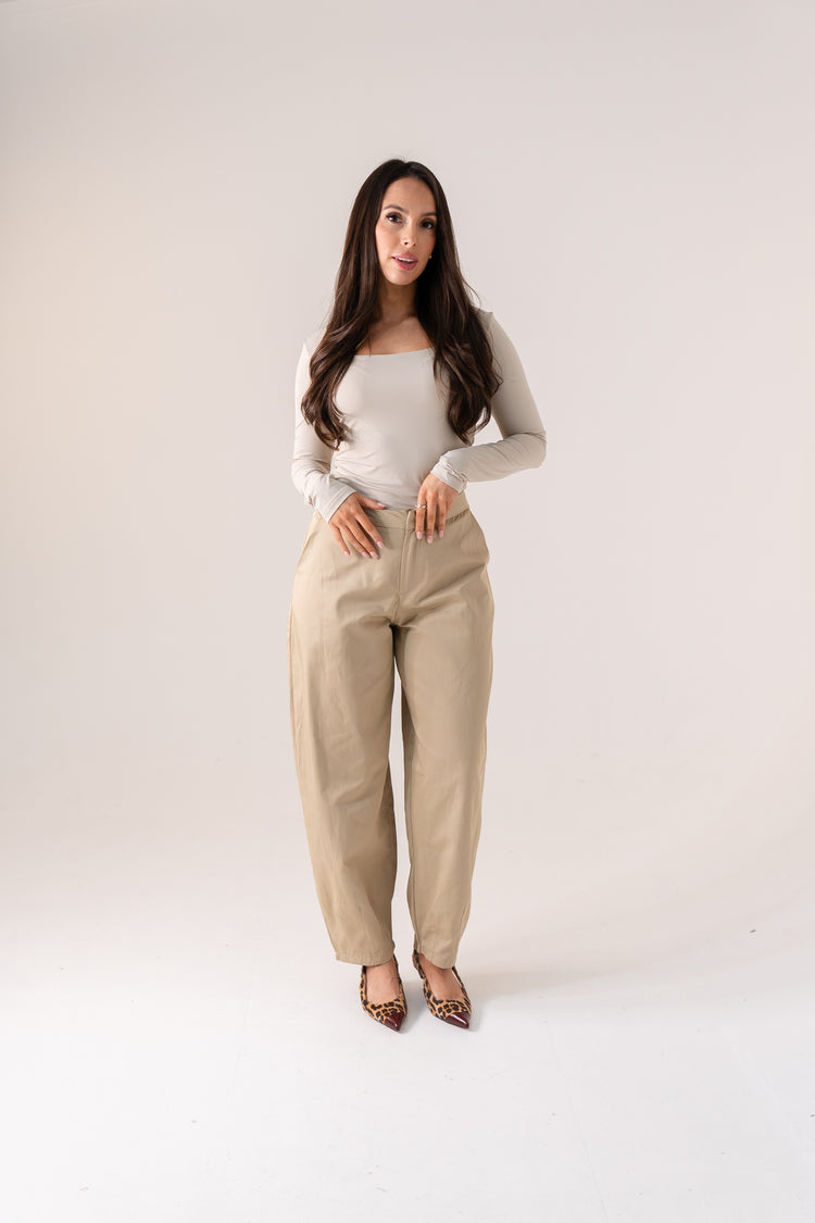 Crafted from a breathable cotton mix, these Ella Barrell Trousers deliver timeless sophistication with contemporary practicality. The barrel leg silhouette creates an effortlessly polished look, while strategically placed pockets provide functional storage. Pleated detailing at the waist adds refined structure and movement, and the secure zip and hook closure ensures a comfortable fit throughout the day. Available in versatile beige, these trousers transition seamlessly from office to weekend wear.