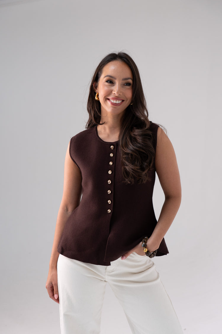 The Ella Knit Waistcoat in Coffee combines refined style with expert tailoring. Crafted from a fine knit fabric, it features a sleeveless design and a classic round neck for layering versatility. The button-front closure adds subtle detail, while the peplum hem enhances the waistline for a flattering silhouette. Perfect for elevating both casual and professional outfits with a sophisticated touch.