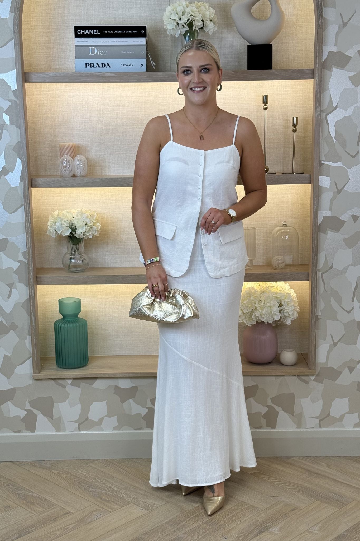 The Elsa Kick Flare Linen Skirt in White is a versatile maxi skirt perfect for any occasion. The kick flare hem adds a touch of modern style to this classic linen mix skirt. Complete the look with the matching waistcoat for a chic and sophisticated outfit.