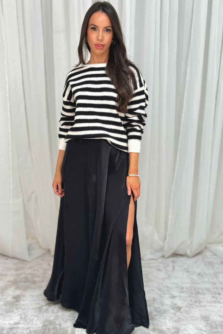 The Elsa Maxi Skirt in Black is a must-have addition to any wardrobe. Its elegant maxi length and subtle sheen make it perfect for any occasion. The broad waistband provides a comfortable fit while the side split adds a touch of sophistication. Stay chic and stylish with this versatile black skirt.