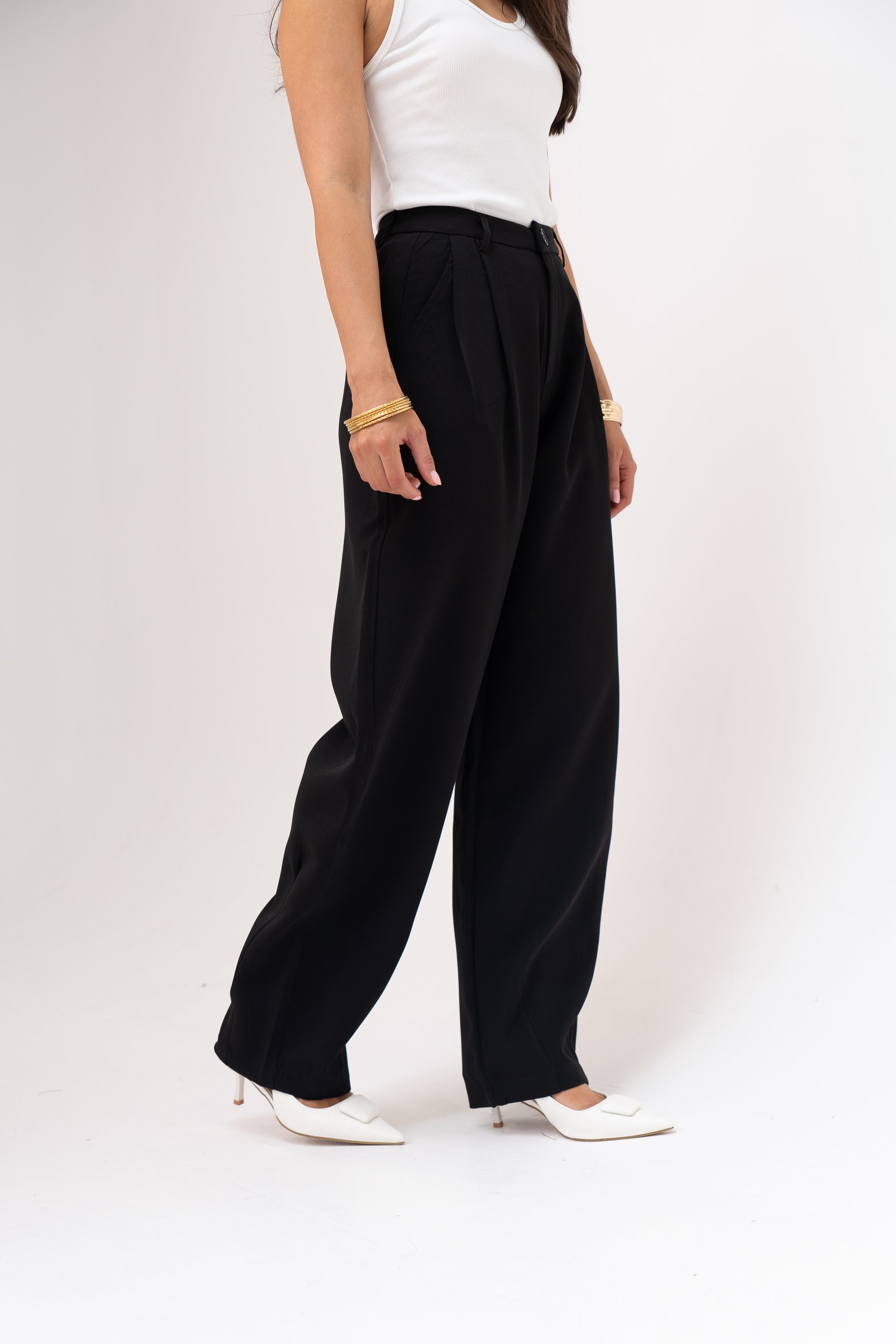 These Freya Barrel Trousers in black combine tailored sophistication with practical design. Featuring a high waist with zip and button closure, they ensure a secure and flattering fit. Pleated details add subtle texture, while the barrel leg silhouette offers a modern, streamlined look. Functional pockets enhance convenience, making these trousers a versatile choice for professional and stylish wardrobes.