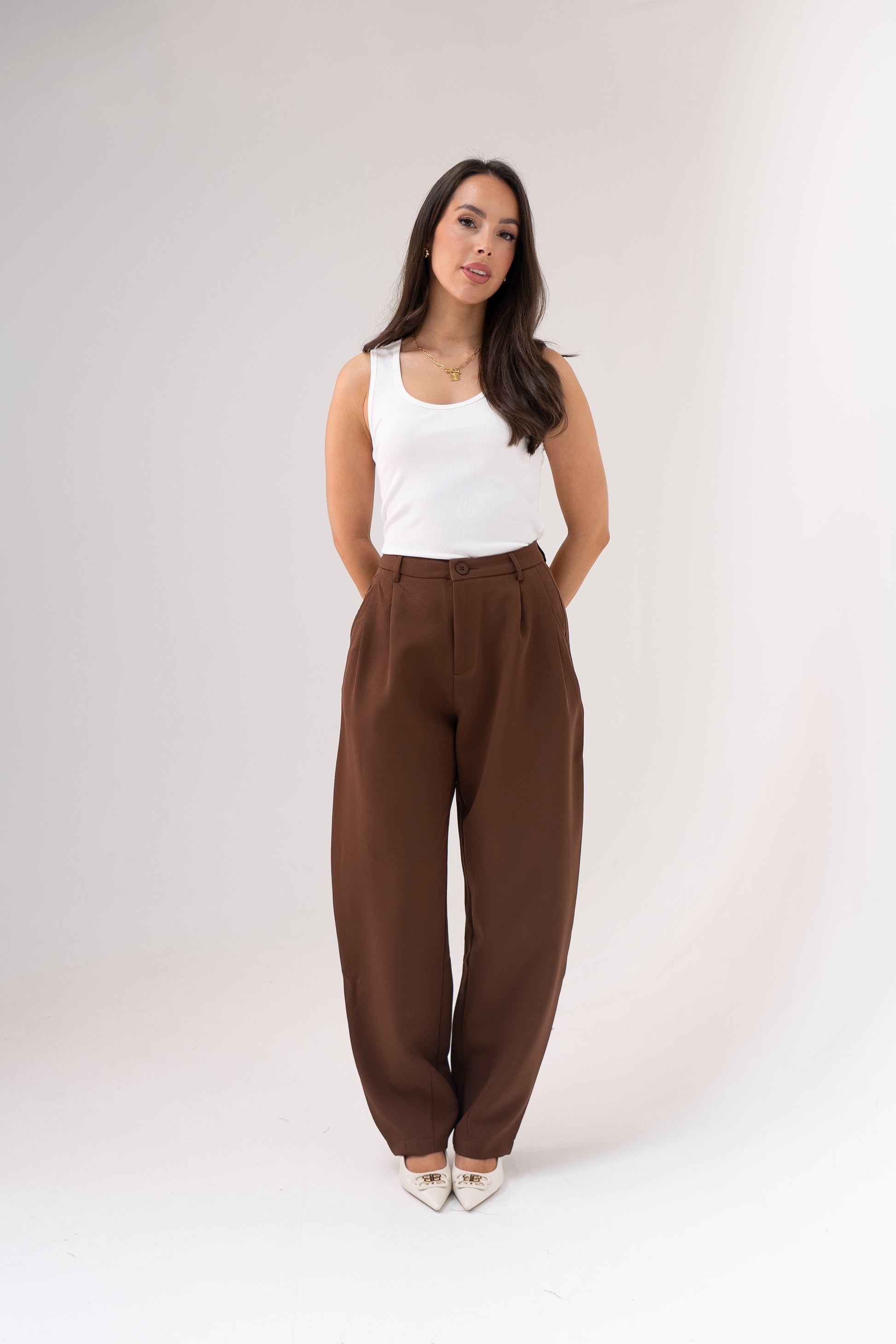 These Freya Barrel Trousers in Chocolate feature a high waist with zip and button closure for a secure fit. Designed with pleated details and practical pockets, they combine style and functionality. The barrel leg silhouette offers a modern, tailored look suitable for professional or casual wear. Crafted to enhance comfort and elegance, these trousers are a versatile addition to any wardrobe.