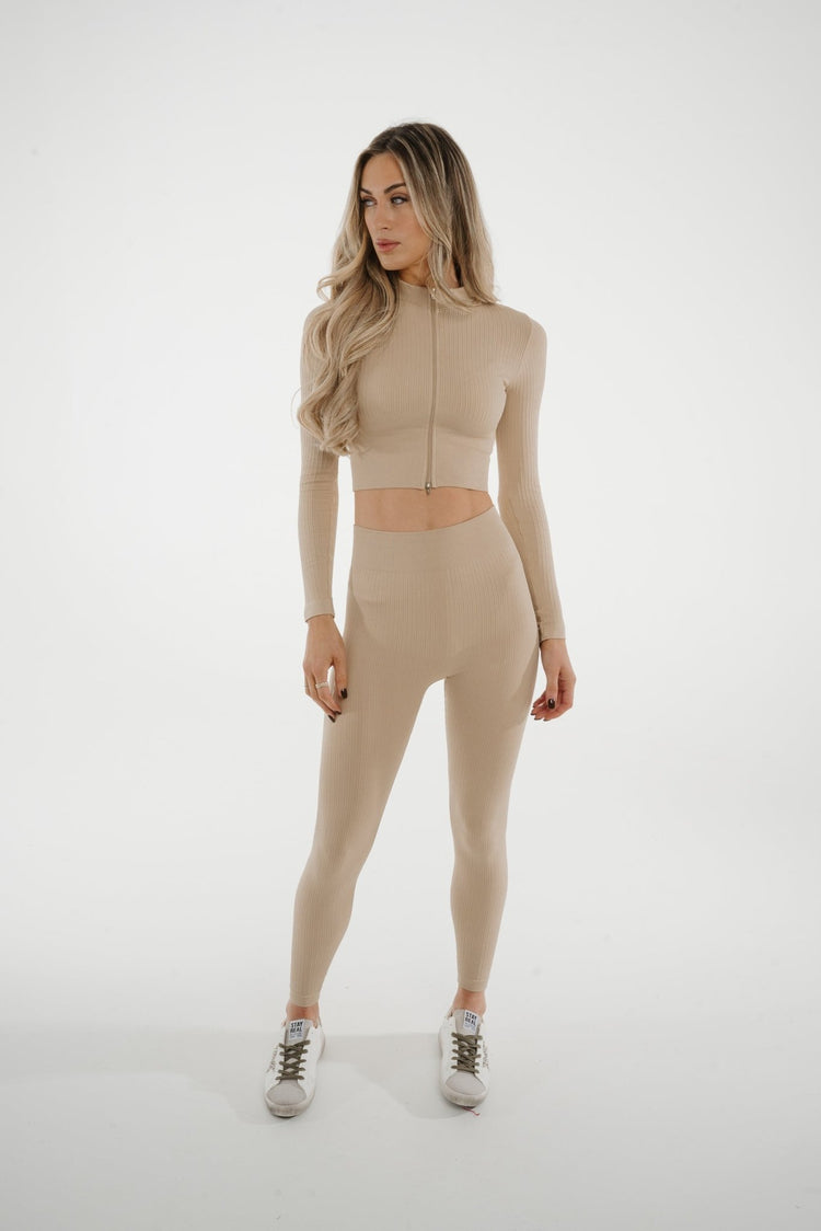 The Freya Leisure Set in Neutral is a versatile and stylish addition to your wardrobe. With a zip long sleeve top, high waist leggings, and ribbed fabric, this two piece set is perfect for layering and offers a comfortable and flattering fit. A must-have staple for any wardrobe.