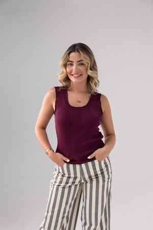 The Holly Lace Trim Ribbed Vest in Bordeaux showcases a sophisticated balance of texture and detail. Featuring a flattering scoop neck and a finely ribbed fabric, this sleeveless vest ensures a comfortable, form-fitting silhouette. The delicate lace-effect trim adds an elegant touch, making it perfect for layering or wearing solo. The rich Bordeaux shade enhances its versatility, suitable for both casual and refined ensembles.