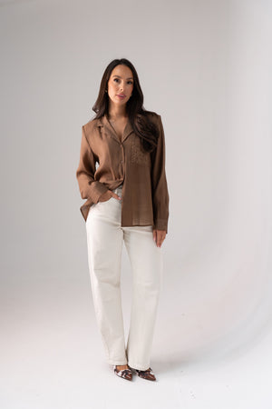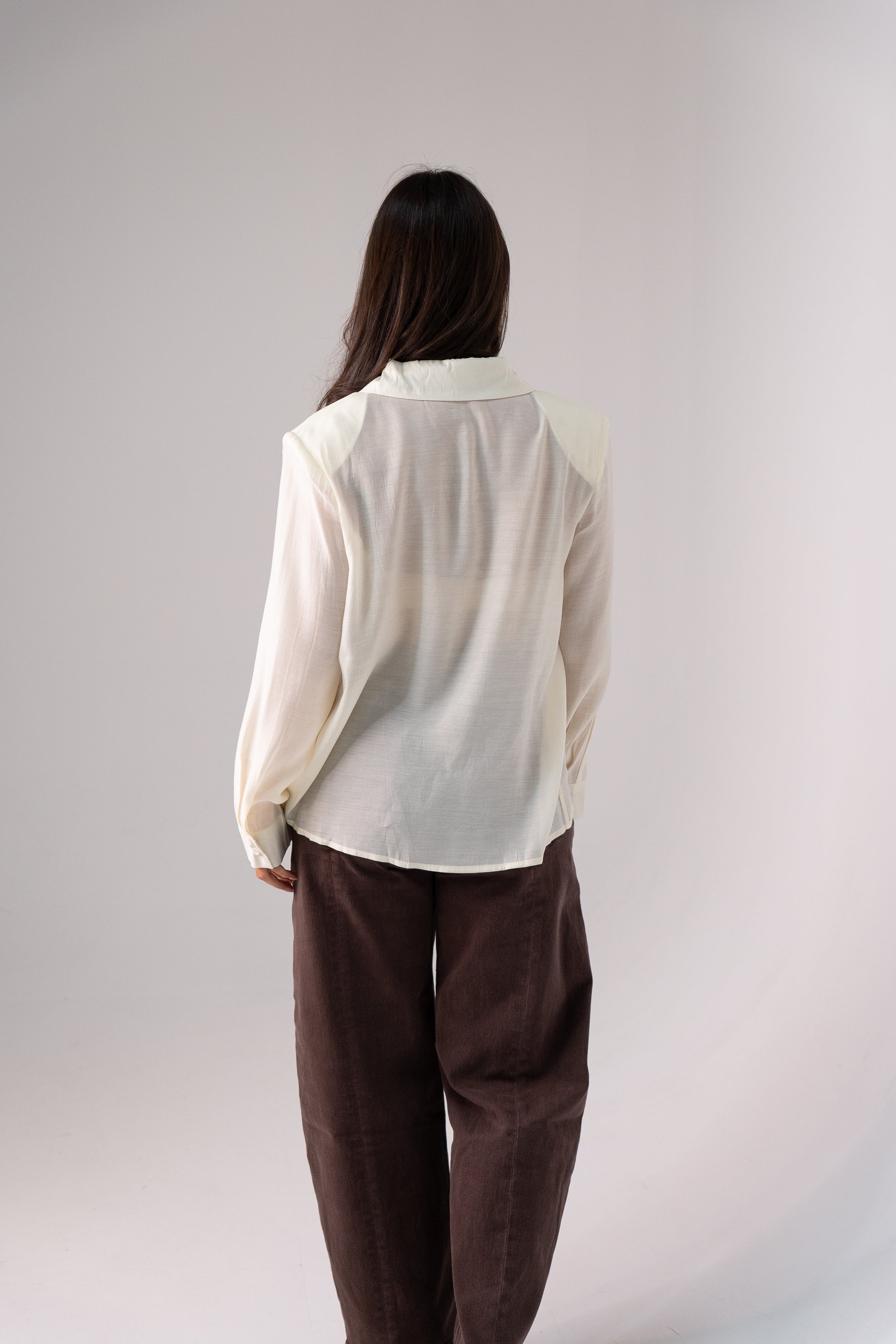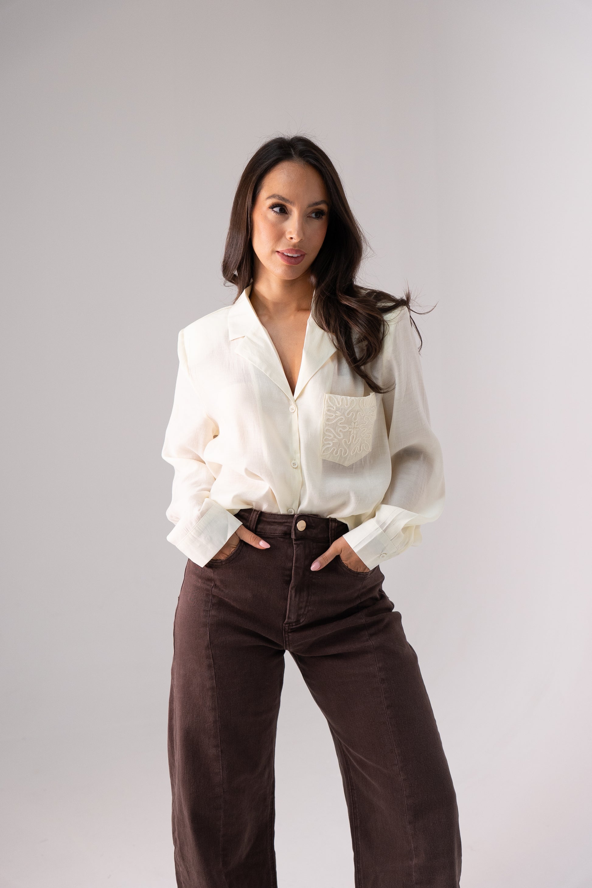 This elegant blouse features a semi-sheer cream fabric that offers a delicate and refined look. Designed with a lapel-style collar, button front, and cuffed long sleeves, it balances classic tailoring with contemporary style. The embroidered pocket adds a subtle decorative detail, enhancing the blouse’s sophisticated appeal. Perfect for layering or wearing on its own, this blouse brings effortless elegance to both professional and casual wardrobes.