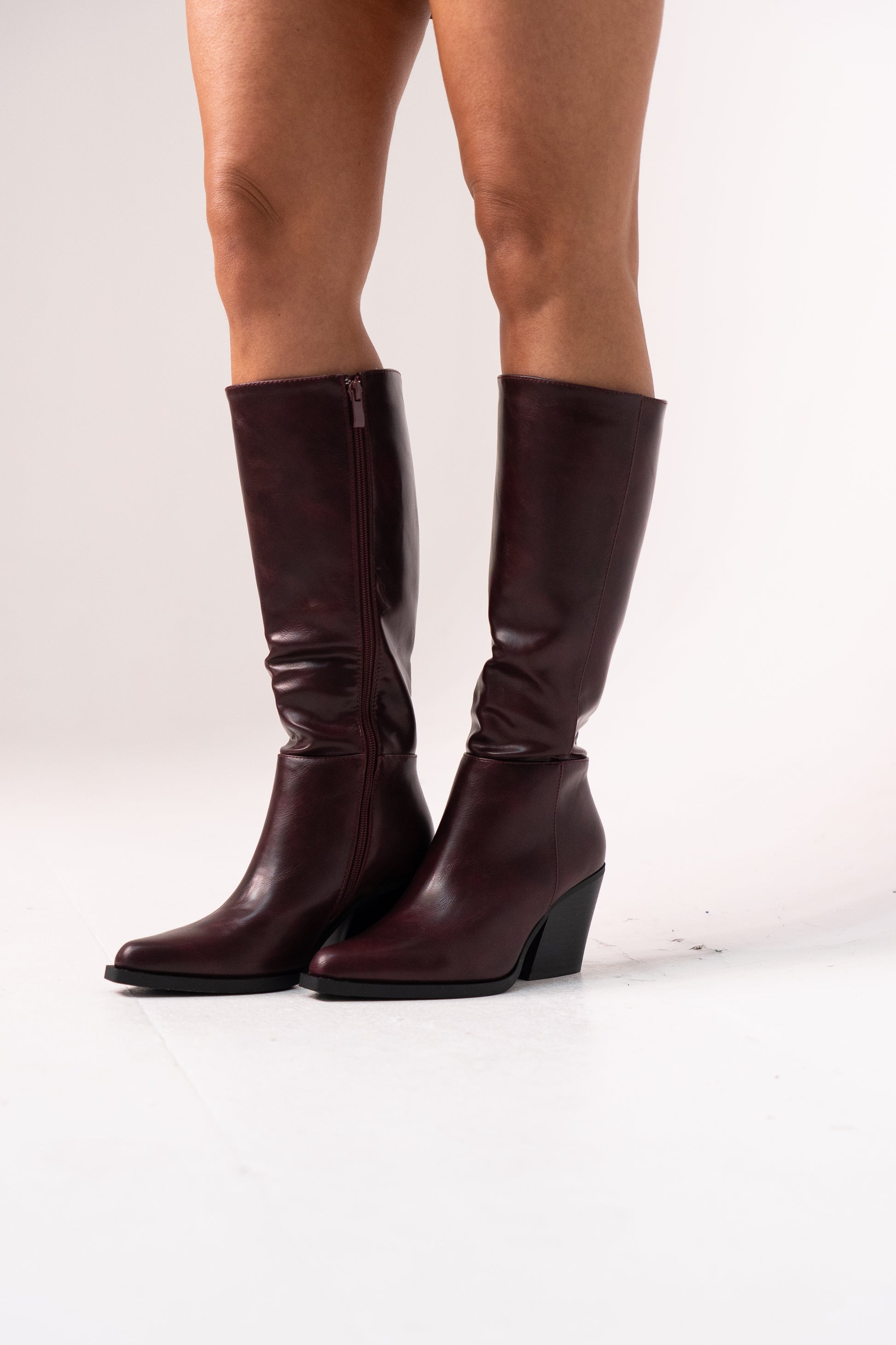 These Izzy Faux Leather Western Boots combine timeless western style with modern details. Crafted in rich wine-coloured faux leather, they feature a pointed toe and an inner zip for easy wear. The sturdy block heel adds both height and stability, making them a versatile choice for both casual and dressier occasions. Perfectly blending fashion and function, these boots bring a refined edge to your wardrobe.