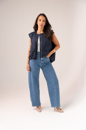 This Jane Sleeveless Zip Jacket offers versatile layering with a clean round neck and a sleek zip-front closure for easy wear. Designed with practical cargo-style pockets and an elasticated hem, it combines functionality with a flattering silhouette. Fully lined for comfort, its neutral tone complements any outfit. Available in one size fitting UK 8-14, this jacket provides a stylish and adaptable addition to your wardrobe.