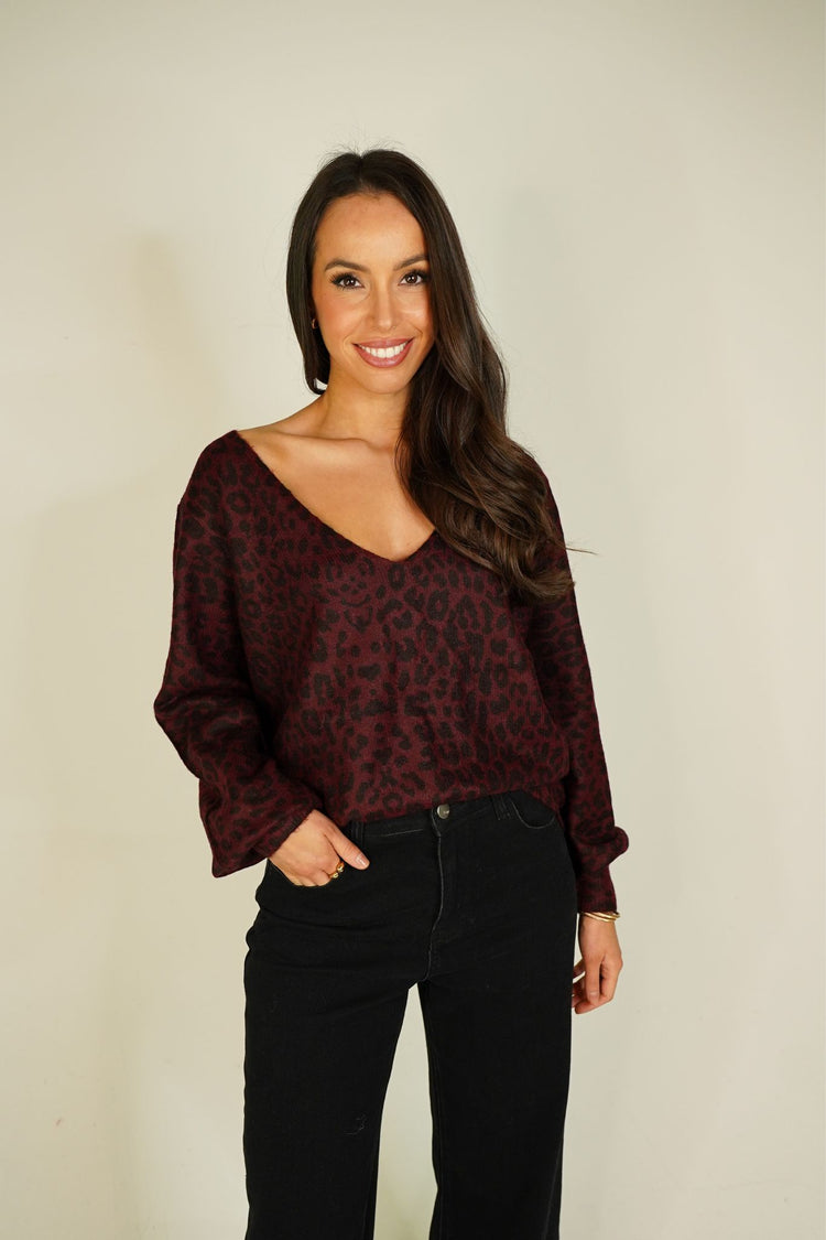 Experience a bold and stylish look with our Kendra Leopard Print Jumper in Bordeaux. Featuring a flattering v-neck, long sleeves, and a trendy leopard print, this one-size jumper is perfect for sizes 8-14. Upgrade your wardrobe with this versatile and on-trend piece.