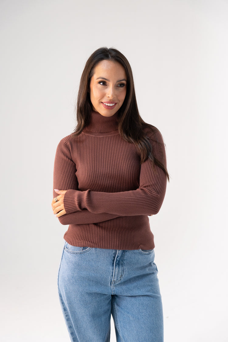 The Kendra Polo Neck Top delivers timeless sophistication in a rich chocolate hue. This essential layering piece features a classic polo neckline and long sleeves crafted from ribbed fabric that provides structure and comfort. Strategically placed side splits enhance movement and create a flattering silhouette, making it equally suited to casual styling or elevated everyday wear. A true wardrobe foundation that transitions effortlessly across seasons and occasions.