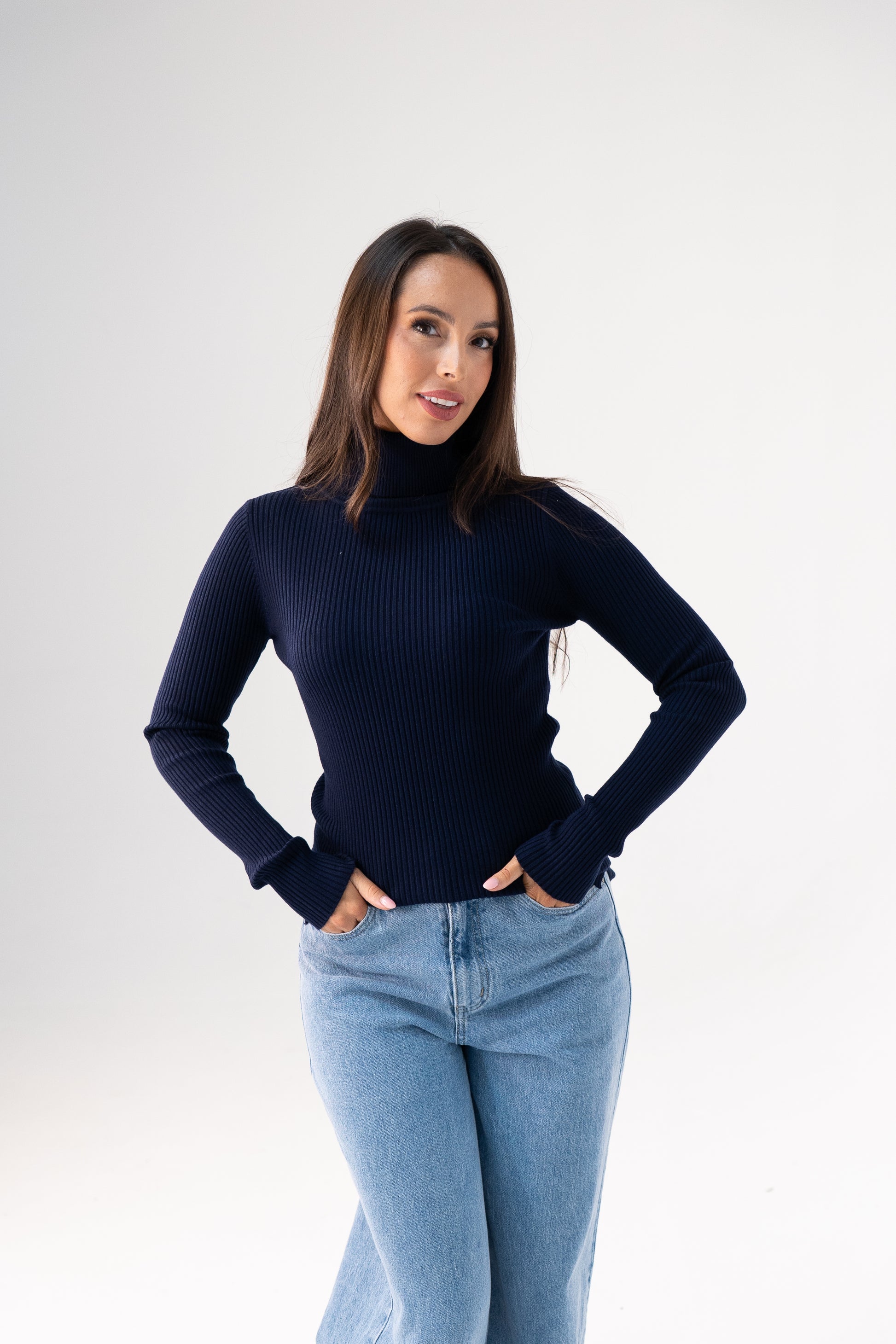 The Kendra Polo Neck Top in Navy exemplifies understated elegance with its meticulously constructed ribbed design. Long sleeves and a classic polo neck create a polished silhouette, whilst strategically placed side splits provide practical comfort without compromising style. In a timeless navy shade, this piece functions as a cornerstone of any curated wardrobe—equally at home layered beneath structured blazers or worn as a refined standalone top. Its versatility and enduring appeal make it an indispensable investment for those seeking pieces that transcend fleeting trends and deliver consistent, sophisticated styling solutions.