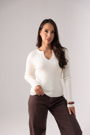 The Kendra Split Neck Ribbed Jumper in Cream offers a refined layering option crafted from fine knit fabric. Its ribbed texture enhances both comfort and style, while the long sleeves and split neck detail provide subtle sophistication. Perfect for versatile wear, this jumper seamlessly integrates into any wardrobe, adding warmth without bulk.