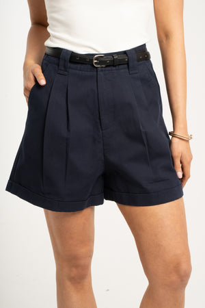 Crafted from a cotton mix, the Kiera High Waist Shorts in Navy feature a straight leg design for a flattering fit. The detachable belt adds versatility, while the pockets and belt loops provide convenience. With a high waist and in a classic navy colour, these shorts are a versatile and stylish addition to your wardrobe.