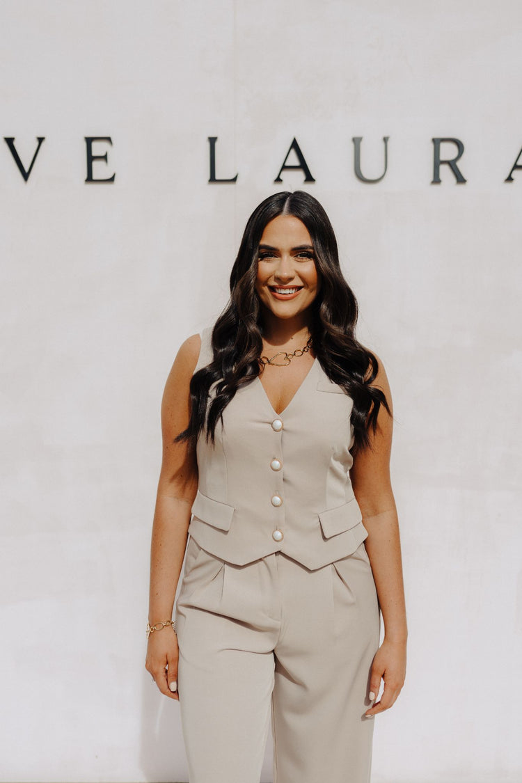 We are so excited for the latest products from Love Laura! Where to start with this beautiful waistcoat? We are obsessed with the stunning shade of neutral, it is so rich and the pearl and gold buttons really finish it off perfectly. The shape is to die for, a classic v-neck waistcoat with pocket details and the looser fit make this such a wearable piece. Complete the look with the matching trousers.