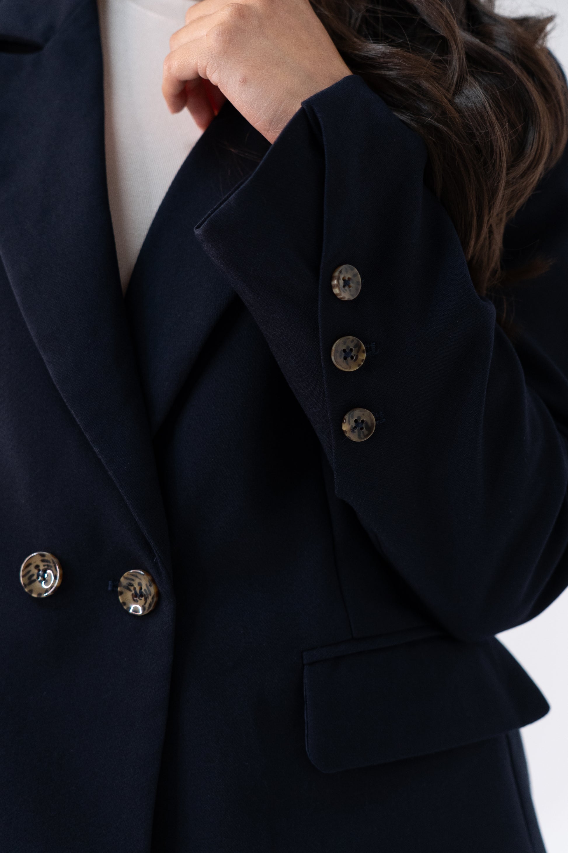 This Love Laura Blazer in Navy offers a tailored double-breasted design with button details on the cuffs and a structured lapel collar. Fully lined for comfort, it features faux pockets that maintain a sleek silhouette. Available in sizes 6 to 18, this blazer combines classic style with modern versatility, making it a polished addition to any wardrobe.