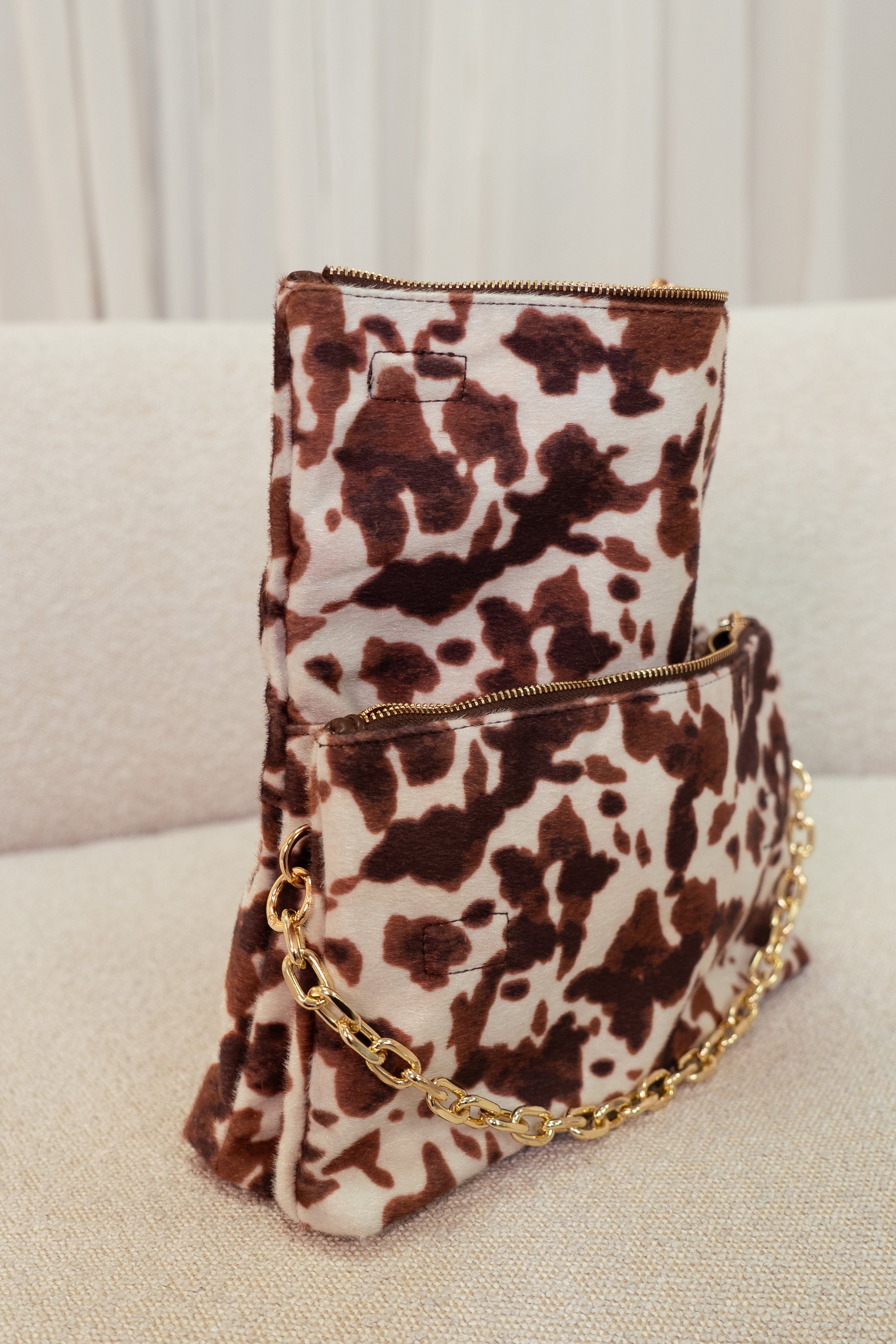 The Love Laura Chain Detail Bag in Cow Print combines distinctive pony-texture aesthetics with practical design. Featuring a gold chain strap alongside an adjustable, detachable brown faux leather shoulder strap, this bag offers versatile styling options. Its fold-over style secured by a magnetic clasp reveals a large zip pocket and three inner compartments, as well as an inner zip pocket for organised storage. Gold-tone zip closures and a signature 'Xo' detail add refined accents, while the lined interior and Love Laura inner tag complete the expert craftsmanship. Ideal for those seeking a statement accessory with functional elegance.