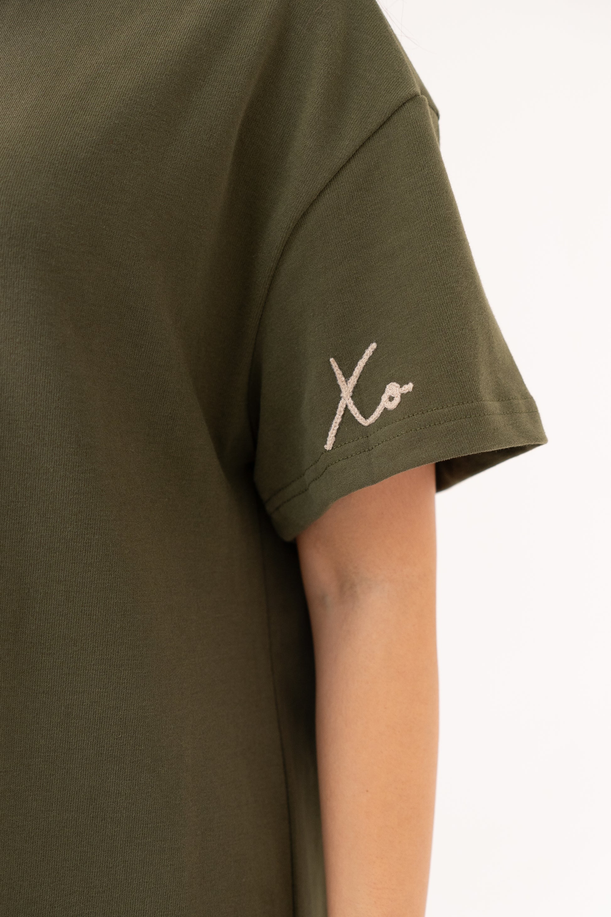 The Love Laura Contrast T-Shirt Dress in Khaki offers a sophisticated take on casual wear. Designed with a round neck and short drop shoulder sleeves, it features XO detail cuffs that add subtle elegance. The standout contrast lace bottom enhances its feminine appeal, creating a balanced look suitable for various occasions. Available in sizes 6-18, this dress combines comfort with style for a flattering fit.