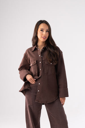 Love Laura Denim Shacket In Chocolate