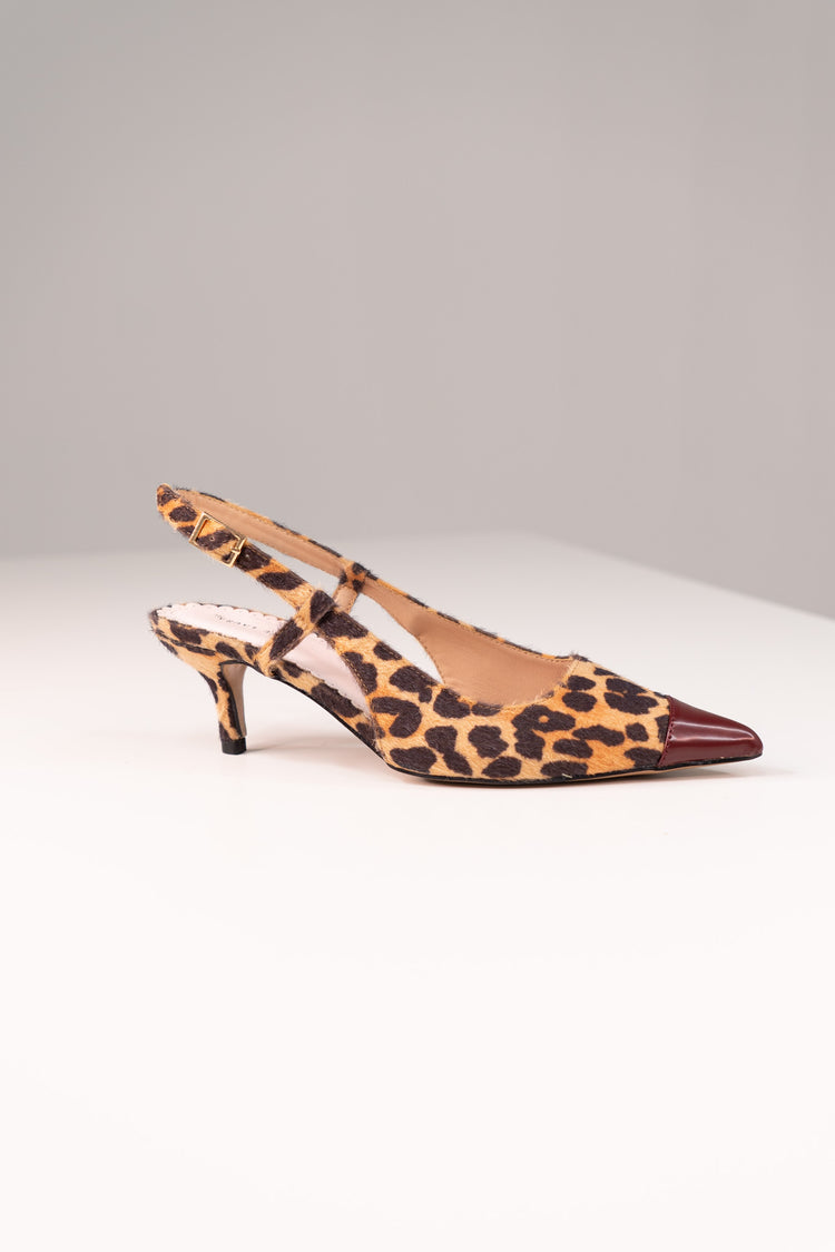 The Love Laura Kitten Heel in Leopard Print expertly blends bold patterns with refined details. Crafted from textured pony material in a striking leopard print, it features a pointed toe with a burgundy PU cap for a subtle contrast. A gold buckle strap adds both style and secure fit, complemented by the slingback design. The comfortable Love Laura branded insole and gold 'xo' sole detail complete this sophisticated kitten heel, available in UK sizes 3-8 for a polished, elegant look.