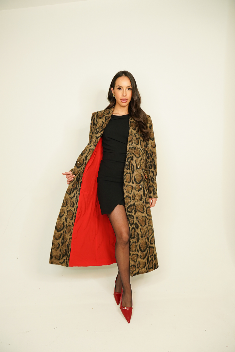 The Love Laura Limited Edition Coat in Leopard combines timeless style with a touch of boldness. This coat features a striking leopard print with a limited edition red lining for a pop of colour. The double-breasted button front, faux pockets, and button detail cuffs add a touch of sophistication, while the back split and shoulder to hem measurement of 119cm provide comfort and versatility. Elevate your wardrobe with this must-have piece.