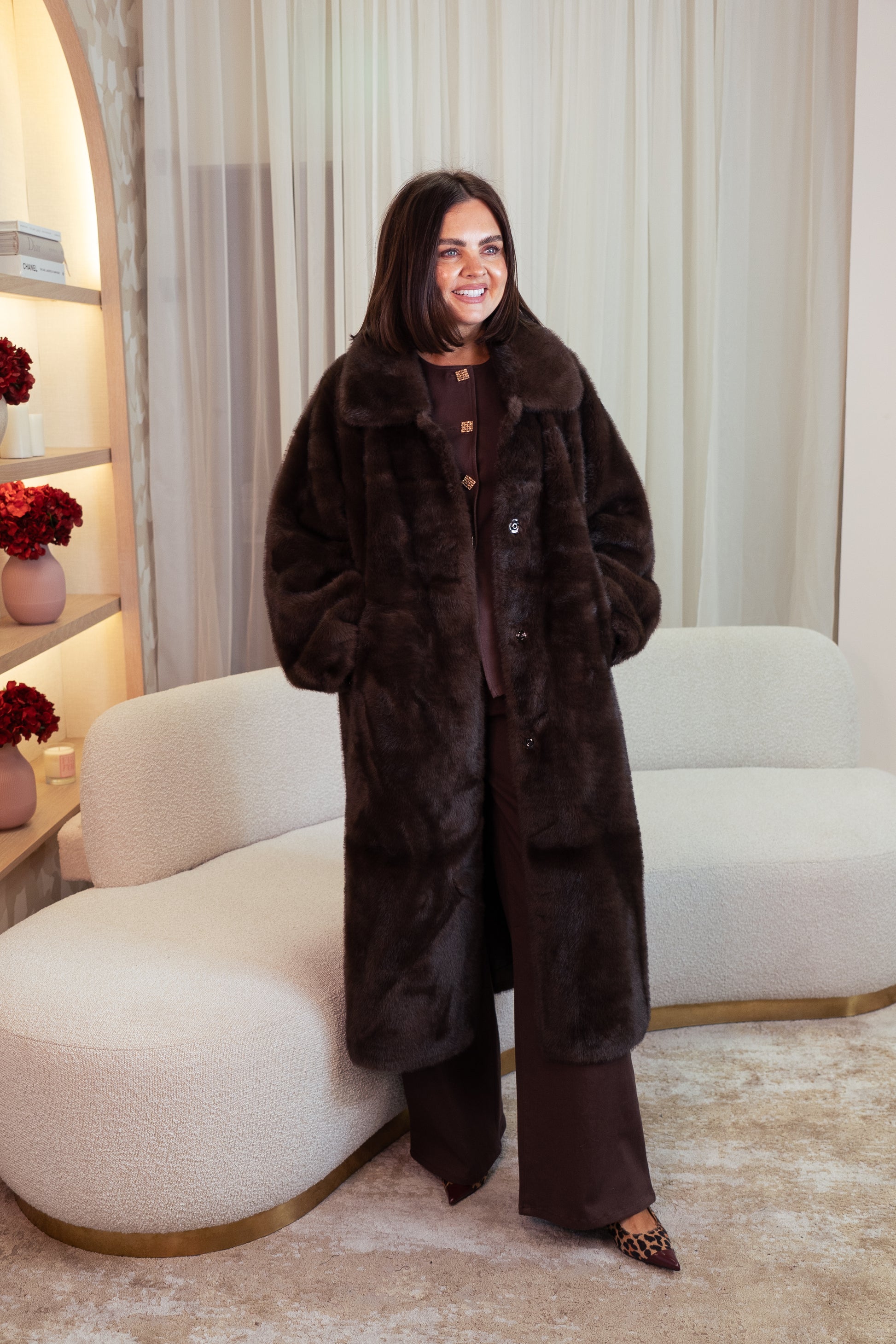 The Love Laura longline coat in rich chocolate brings timeless elegance to your seasonal rotation. Crafted from sumptuous synthetic faux fur, this extended silhouette flatters the frame whilst the structured collar and pop button front add sophisticated detailing. Long sleeves deliver comprehensive coverage, and the fully lined interior guarantees comfort and longevity. Thoughtfully positioned pockets provide everyday practicality. Available in two expertly proportioned fits—SM accommodating sizes 6-12 and ML for sizes 12-16—this versatile piece seamlessly complements both classic and contemporary wardrobes with understated luxury.
