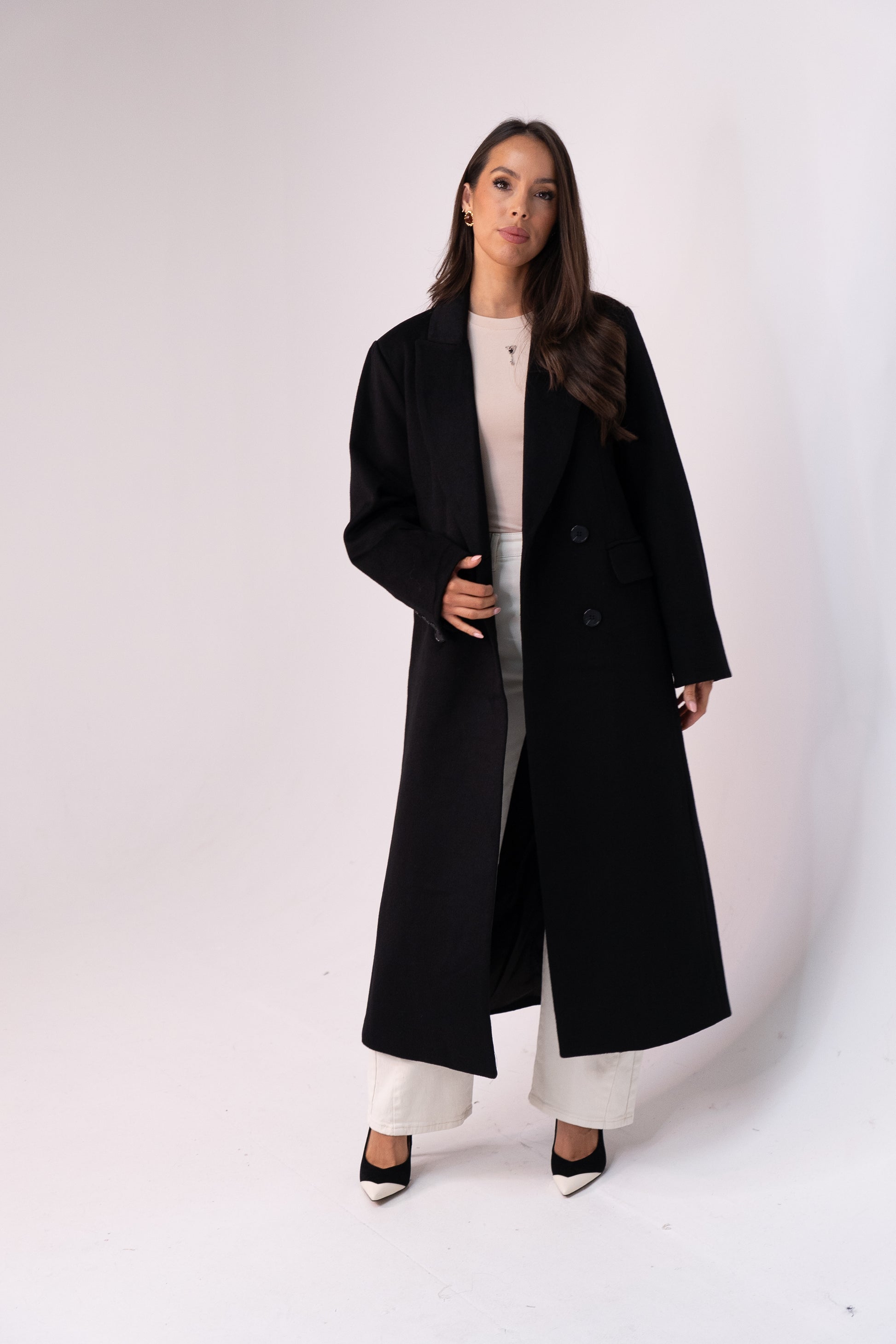 The Love Laura Overcoat in Black offers a tailored, regular fit designed to flatter sizes 8-16. Crafted with a lined interior for comfort, it features a classic lapel collar and a double-breasted button front that adds timeless sophistication. Practical pockets enhance functionality, while button-detail cuffs provide refined finishing touches. This versatile overcoat combines style and practicality, making it an essential piece for a polished, professional look.