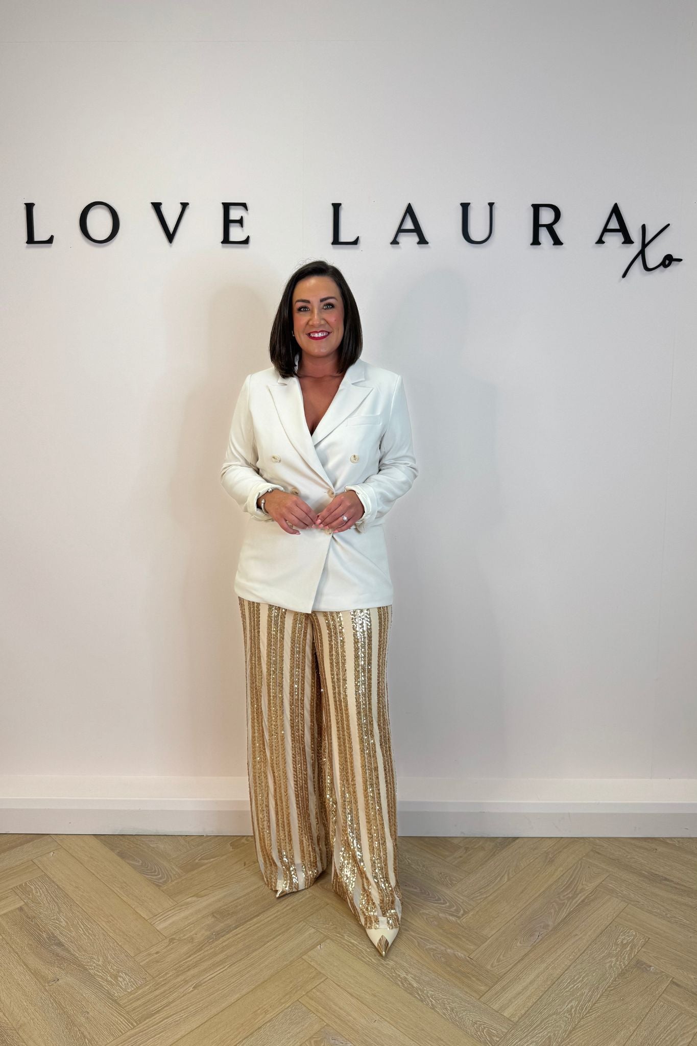 These Love Laura Sequin Trousers are expertly crafted with high waist and wide leg design for a flattering silhouette. The broad waistband provides added comfort and the sequin embellished champagne sequins on a neutral background add a touch of glamour. Lined and with a concealed side zip for a smooth fit.