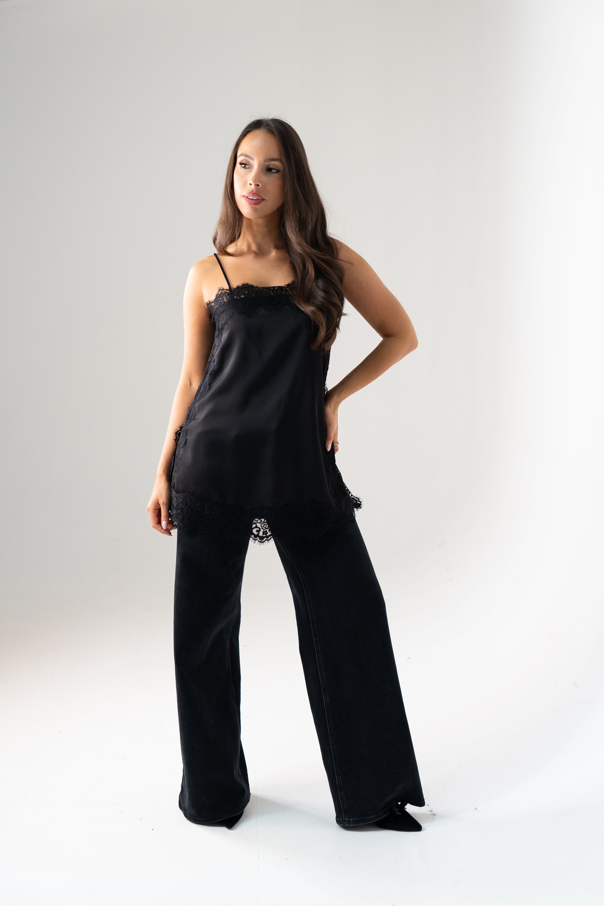 The Millie Lace Trim Cami in Black combines understated elegance with practical design. Featuring a straight neckline and non-adjustable straps for a streamlined silhouette, this piece showcases delicate lace panelling at the sides for added visual interest. The longer length provides enhanced coverage, whilst the luxurious satin texture delivers a refined finish. A subtle side split offers ease of movement, making this cami versatile for layering or standalone wear. Perfect for those seeking a sophisticated staple with thoughtful detailing.