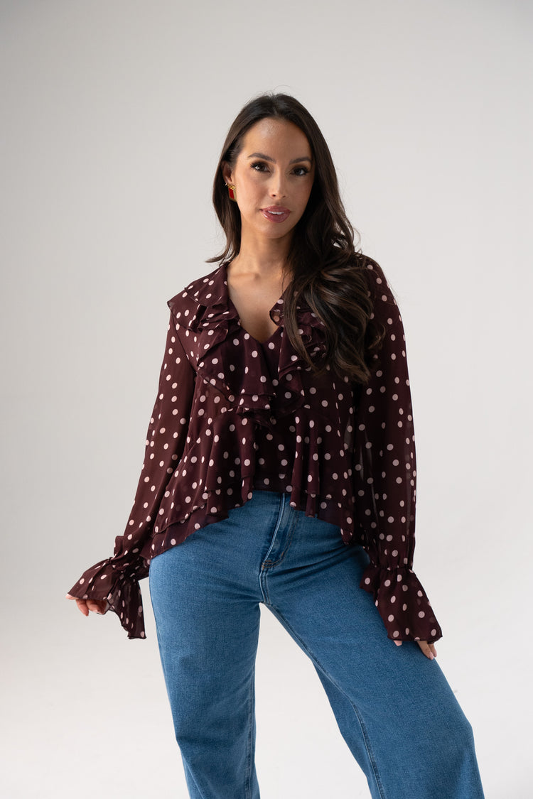 Elevate your wardrobe with the Millie Sheer Polka Dot Top in Wine. Featuring a flattering V-neckline and delicate ruffle details on the front and cuffs, this blouse blends elegance with subtle playfulness. The button-front design and elasticated cuffs ensure a comfortable yet refined fit. Crafted from sheer fabric adorned with classic polka dots, it offers a sophisticated layering option in a rich wine hue, perfect for both day and evening wear.
