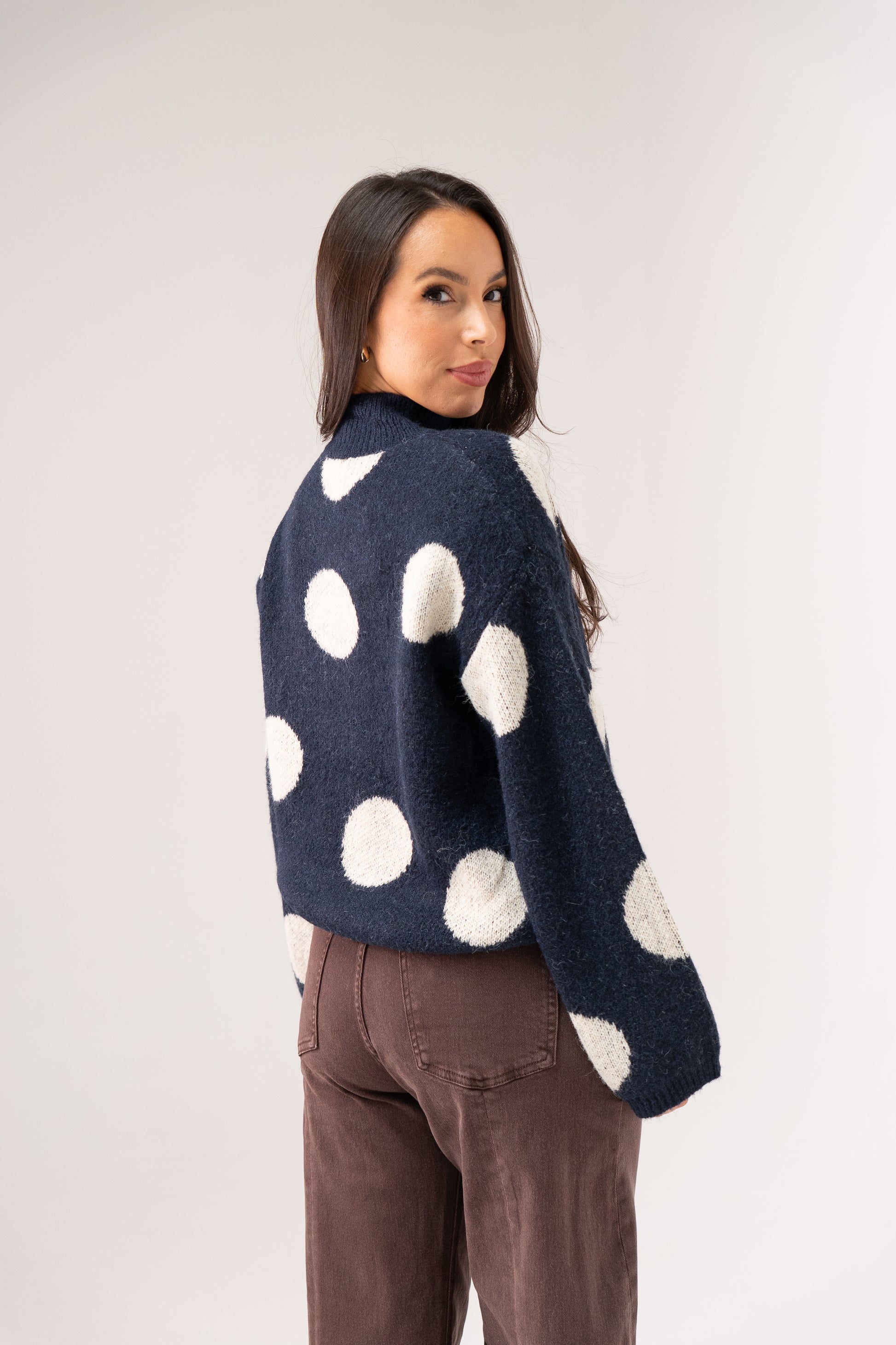 Embrace effortless style with the Millie Spotted Jumper in Navy. Crafted from a soft wool blend, this long-sleeve jumper features a high neck and a relaxed drop shoulder design for comfortable layering. Its versatile one-size fit (8-14) suits a range of body shapes, while the bold large spot pattern adds a contemporary edge to your wardrobe essentials. Perfect for cool days, it combines warmth with modern sophistication.