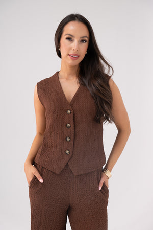 These Millie Waffle Texture Trousers in Coffee feature a high, elasticated waist for a comfortable, secure fit. Crafted from textured waffle material, they offer subtle depth and style. The straight-leg design ensures a flattering silhouette, while practical pockets add convenience. Pair them with the matching waistcoat for a coordinated, polished look. Ideal for those seeking both comfort and sophistication in their wardrobe.