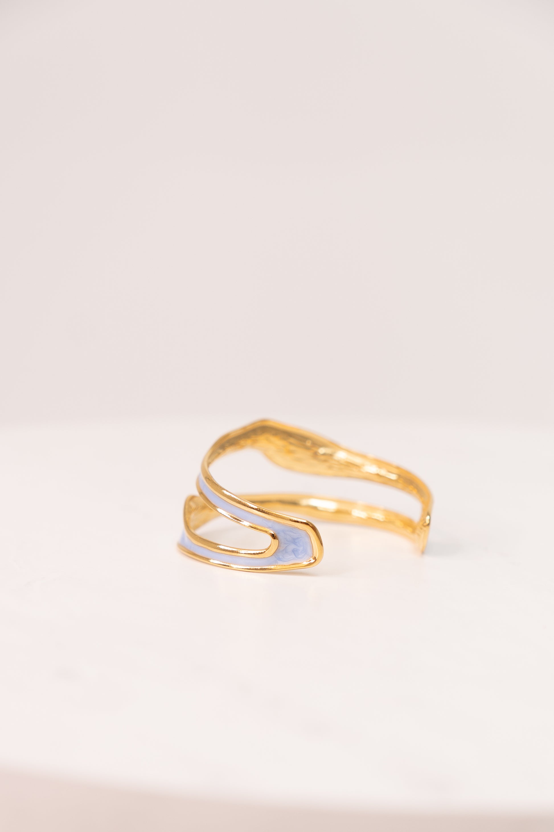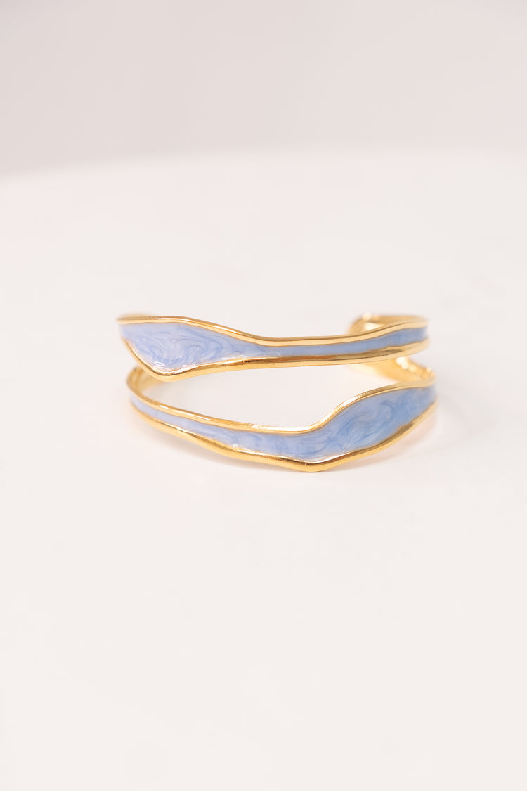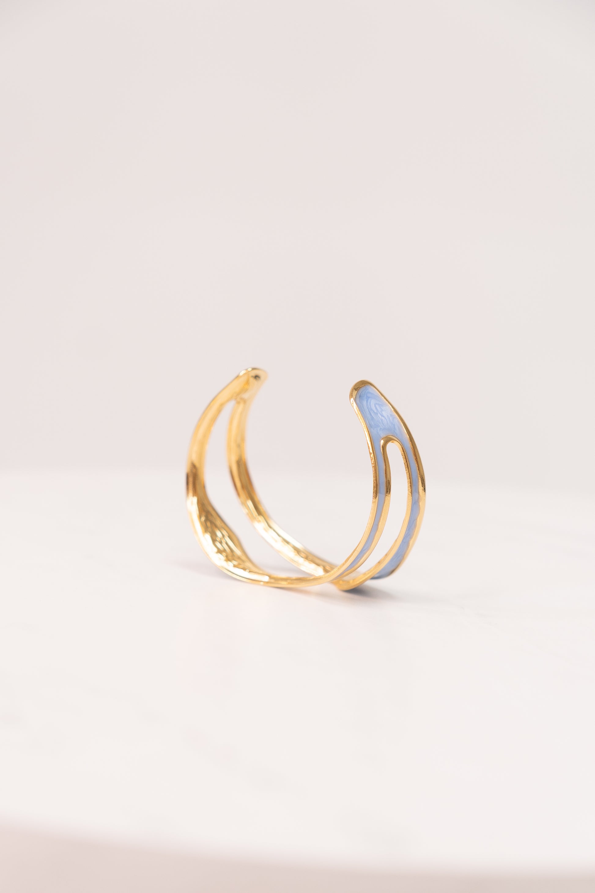 This expertly crafted bangle features a layered, open cuff design in a striking gold colour. Made from durable stainless steel, it includes a vibrant blue enamel inset that adds a refined touch. Its one-size-fits-all style ensures versatile wear, making it a sophisticated accessory for any collection.