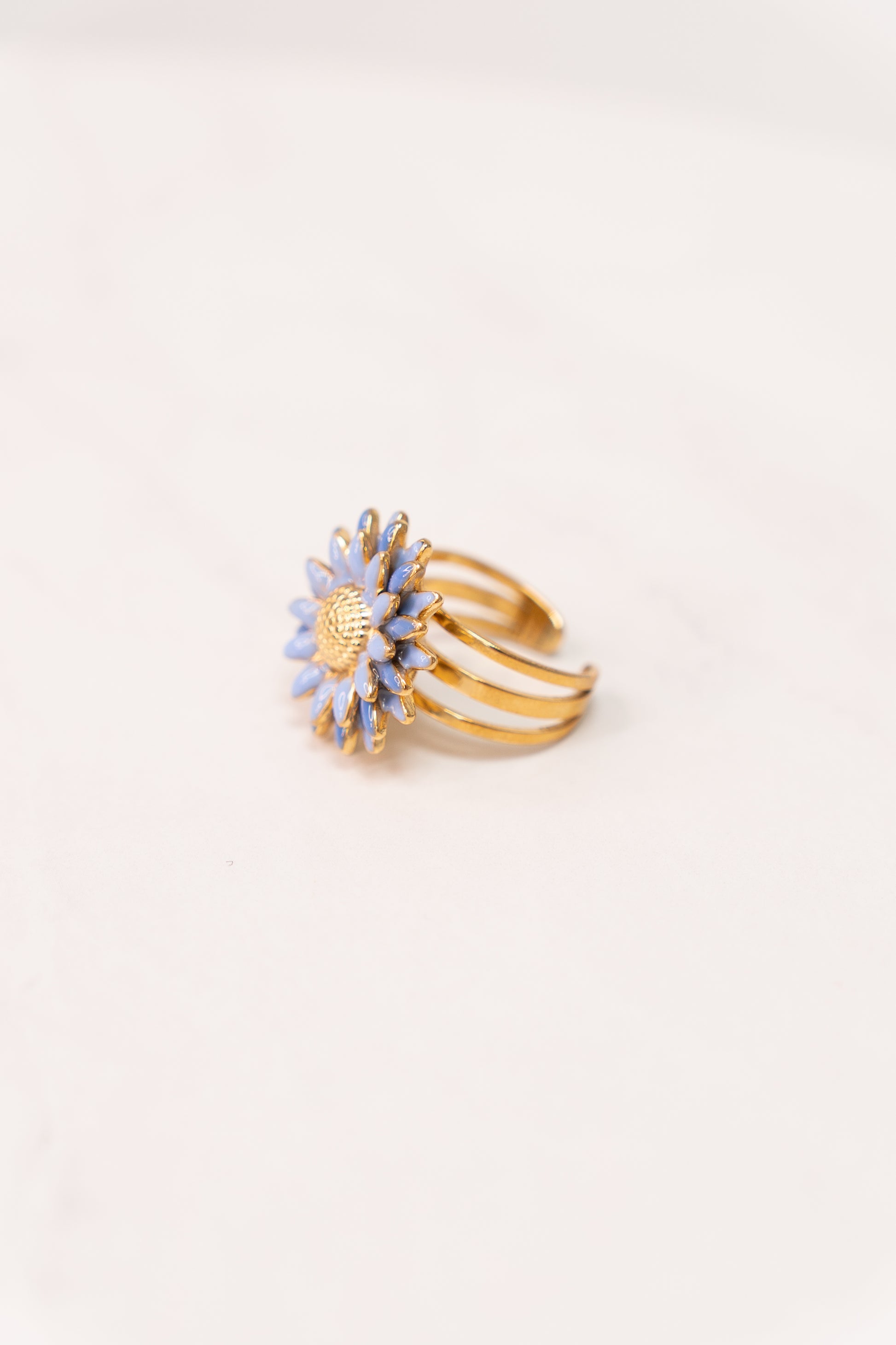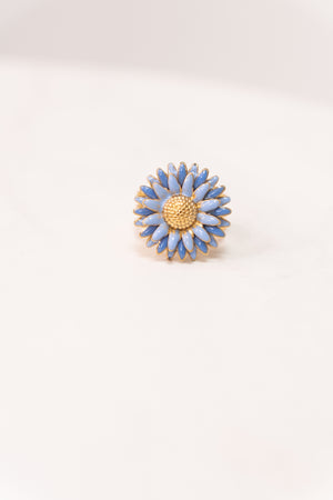 This Olive Floral Ring in Blue features a layered floral design crafted from durable stainless steel with a gold-coloured finish. Its adjustable one-size fit ensures comfort and versatility, making it a refined accessory that complements both casual and formal styles with expert elegance.