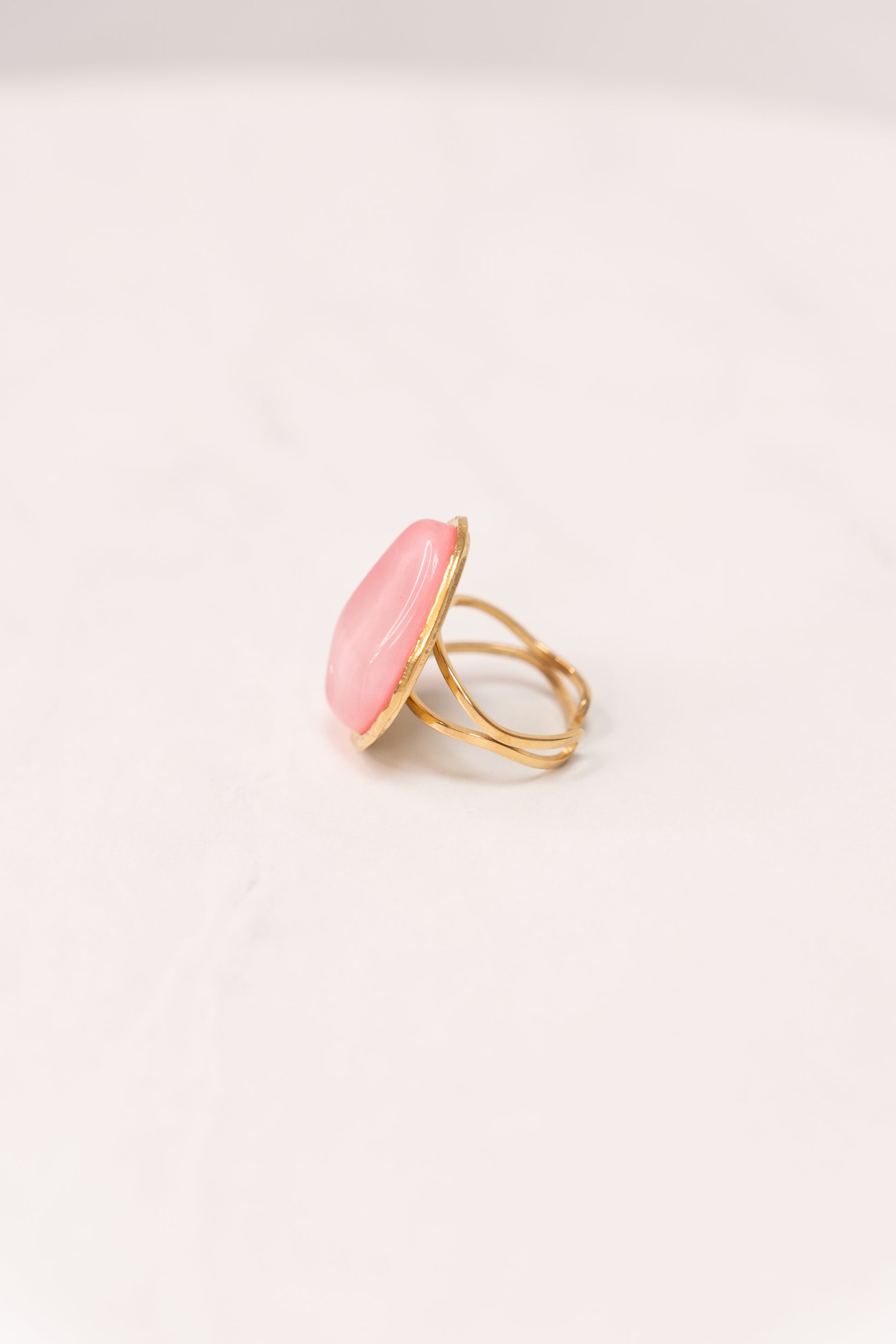 This Olive Large Gemstone Ring features an elegant oval-shaped pink gemstone set in a gold-coloured stainless steel band. Designed in one adjustable size, it offers a comfortable and customisable fit. Combining durability with refined style, this ring is a sophisticated accessory for any collection.