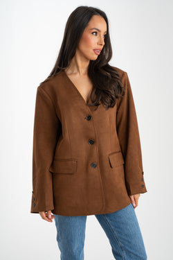 The Paige Collarless Blazer in Camel is a sophisticated addition to any wardrobe. Featuring a button front, faux pockets, and a v-neck, this blazer is crafted with faux suede for a luxurious look and feel. The camel colour adds a touch of elegance, while the lined interior ensures comfort all day long.
