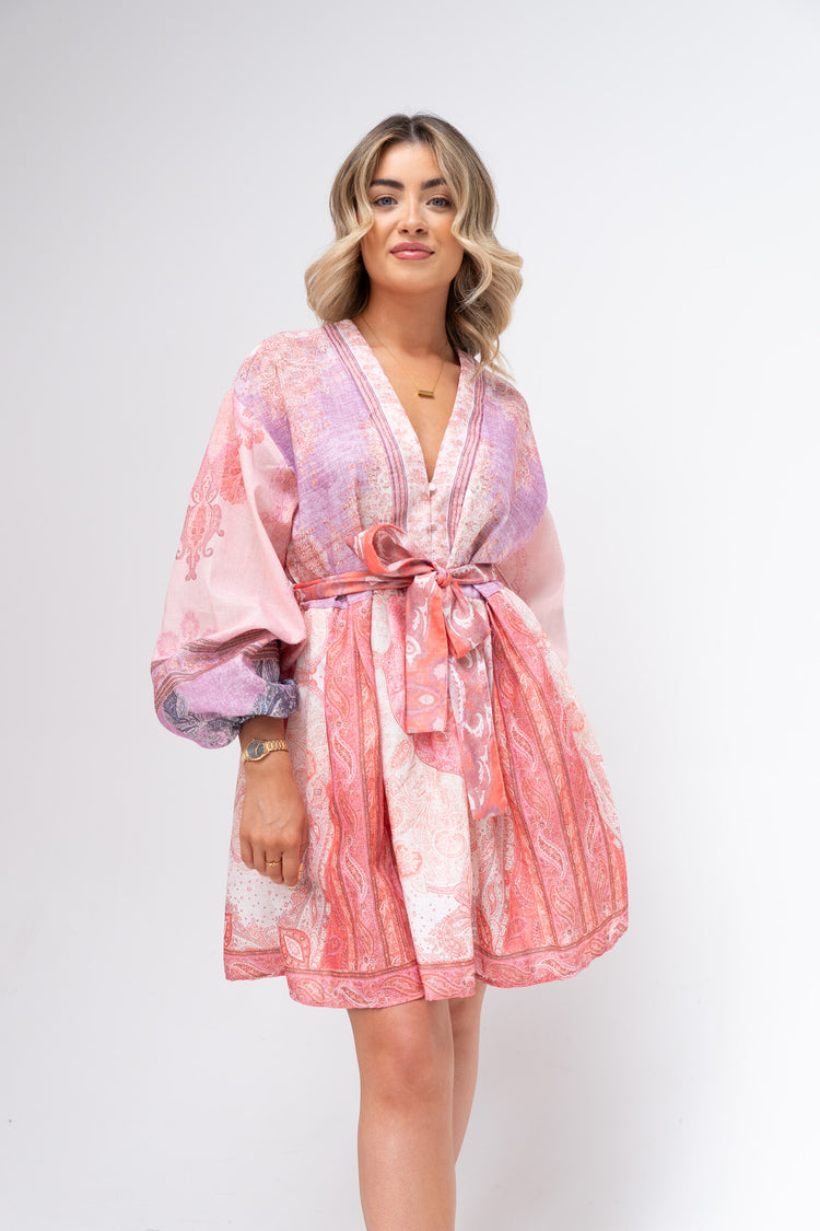 This Polly Balloon Sleeve Dress features a flattering V-neck and button-front design, enhanced by a tie waist belt that defines your silhouette. The elasticated cuffs and short length add a modern touch, while the pink mix print brings a fresh, stylish vibe. Perfect for elevating your wardrobe with a blend of comfort and elegance.
