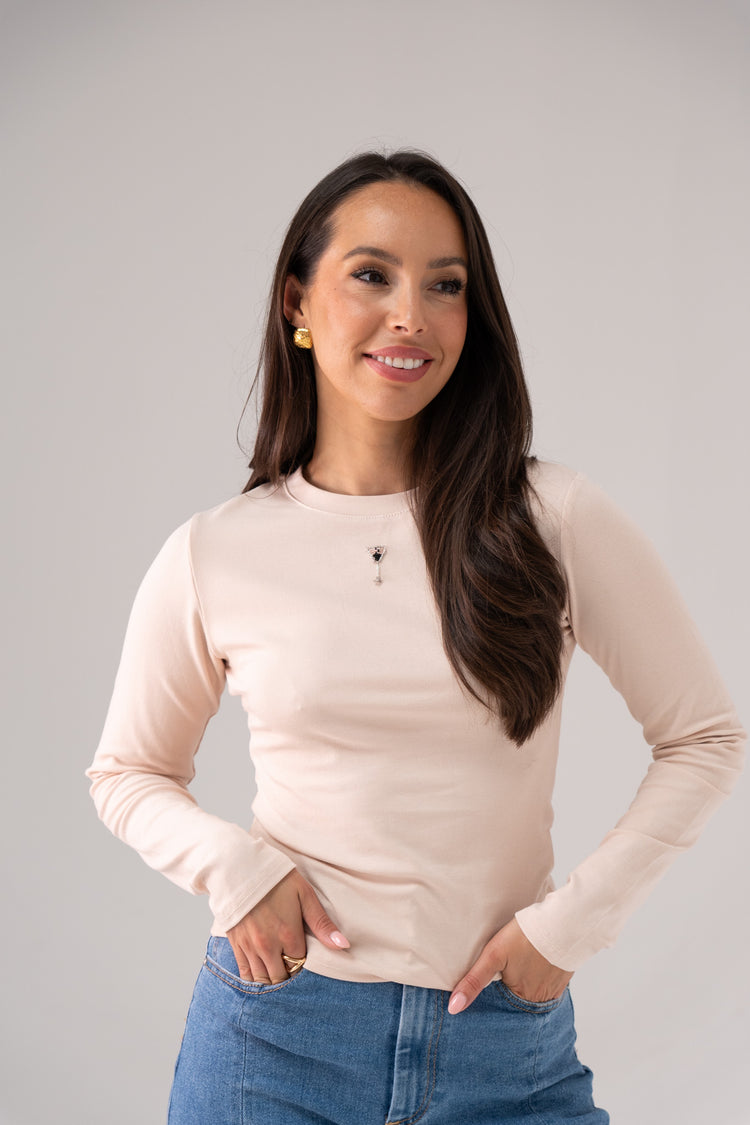 This Willow long sleeve top features a classic round neck and subtle stretch for comfortable wear throughout the day. The beige colour provides a versatile base, while the embellished detail motif adds a refined, sophisticated touch, making it suitable for both professional and elegant casual occasions.